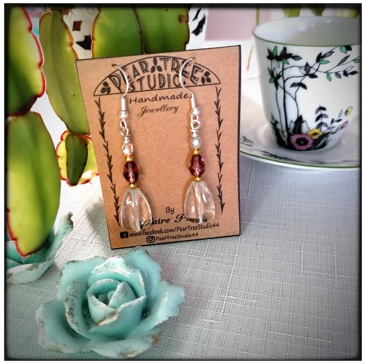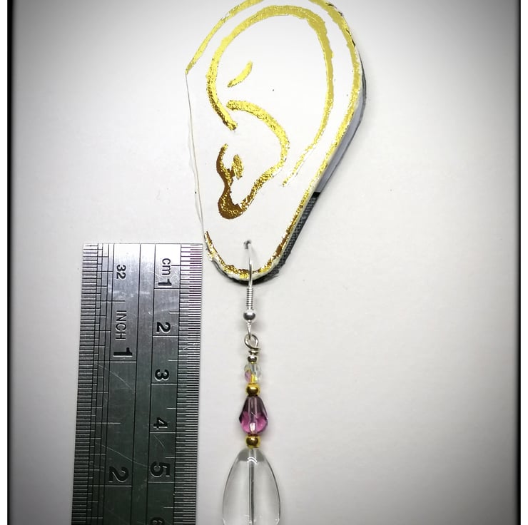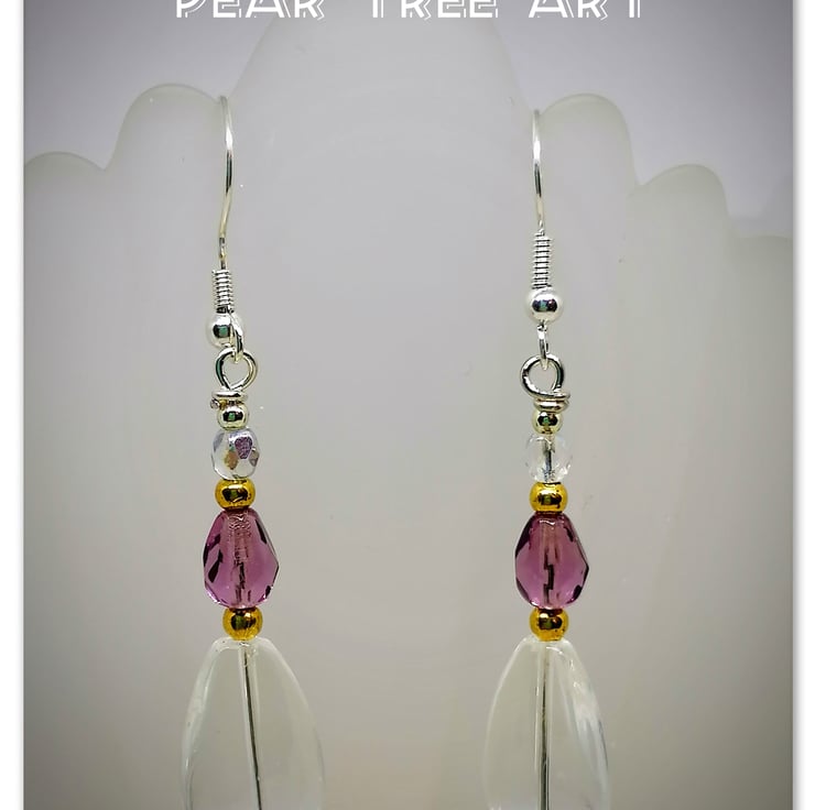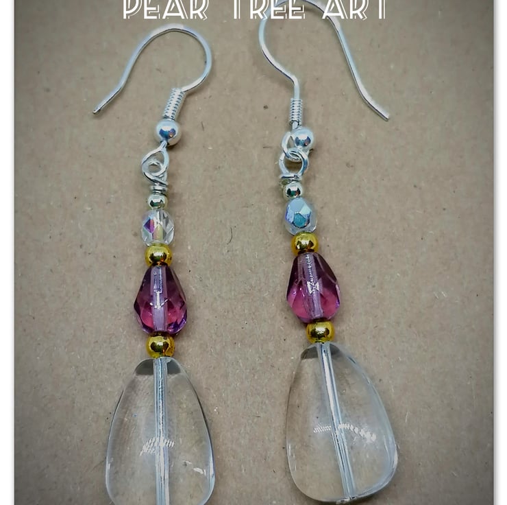 Glass drop earrings with purple crystal beads on Silver plated hooks.