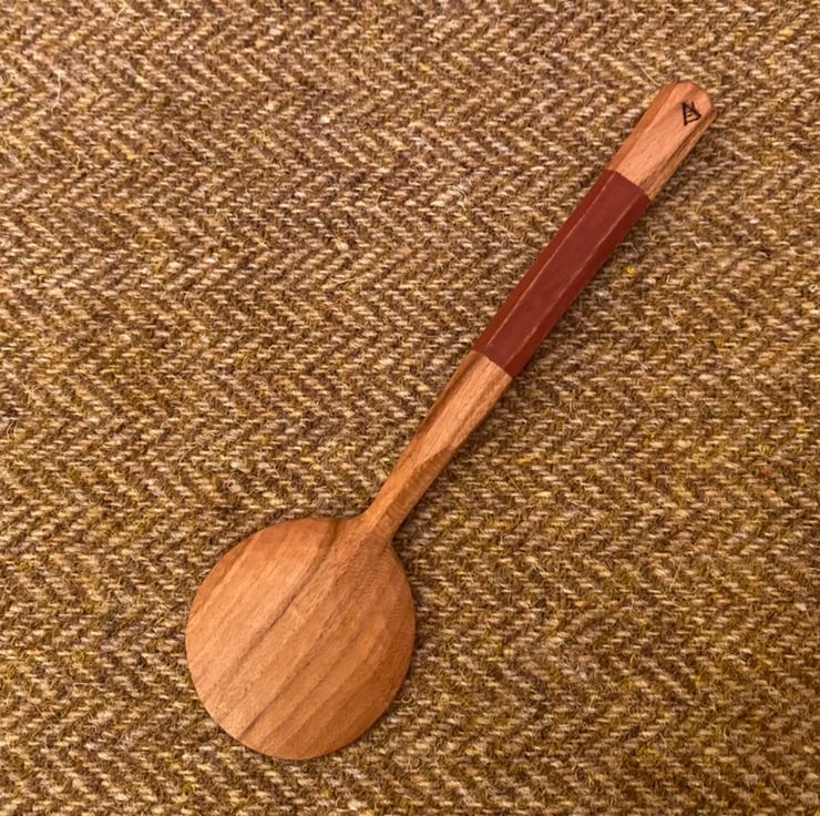 The spoon has been made from a freshly cut log, which was taken to its final shape using traditional methods- splitting the log firstly into a 'blank' by froe tool, drawing on a rough shape before axing this out and then finalising the shape using an array of knives. This leaves beautiful cut facets which mean no sanding is required. After drying, the spoon receives a final shaping by knife, before the handle is painted using food safe milk paint and a makers mark is burned on. The spoon is then burnished using a smooth Scottish pebble leaving a silky feeling to the wood. And finally the wood is sealed using organic food grade linseed oil.
