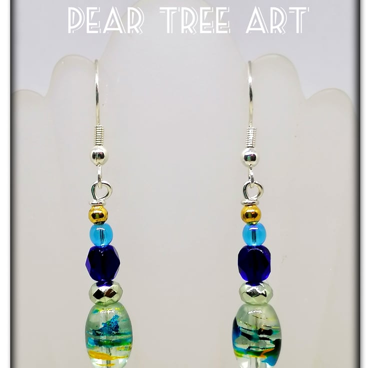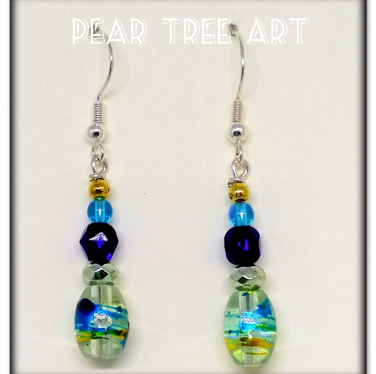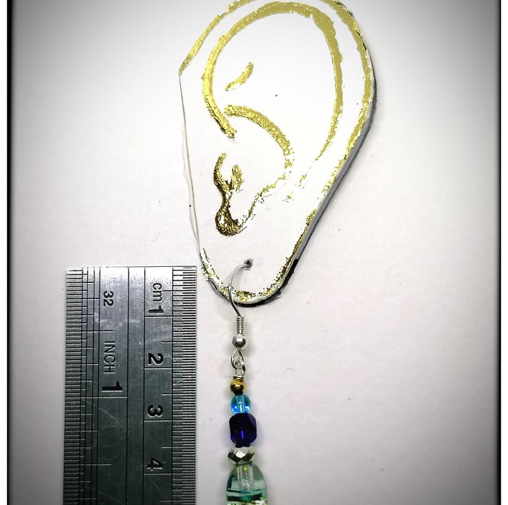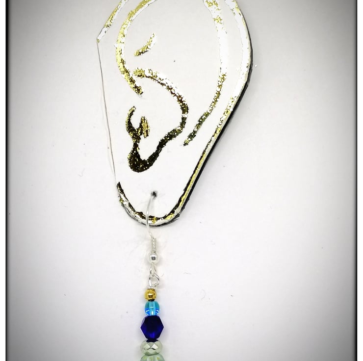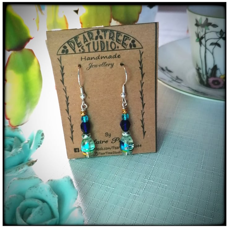 Small glass bead earrings with blue crystal beads on Silver plated hooks.