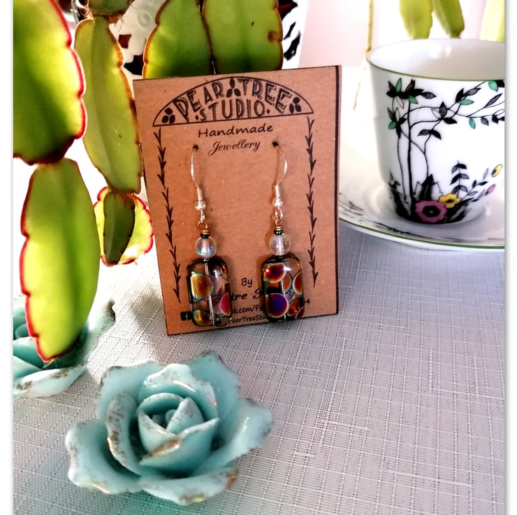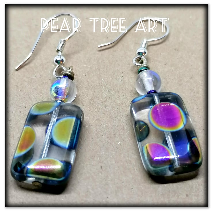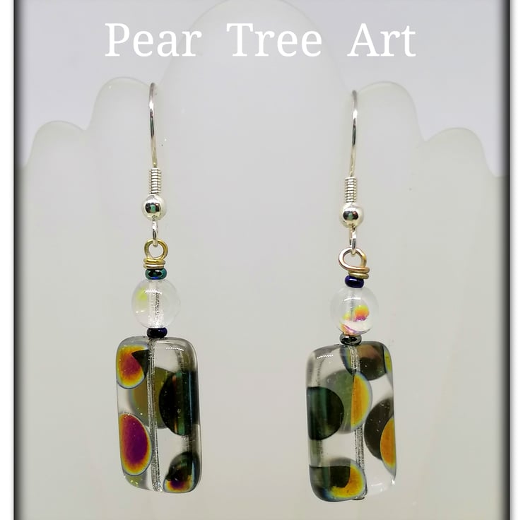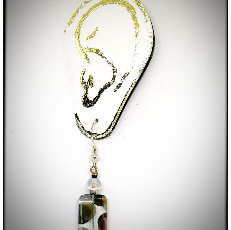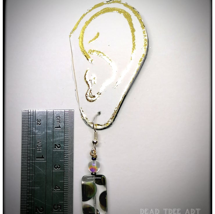 Glass bead earrings with metallic spot pattern on Silver plated hooks.