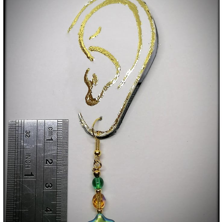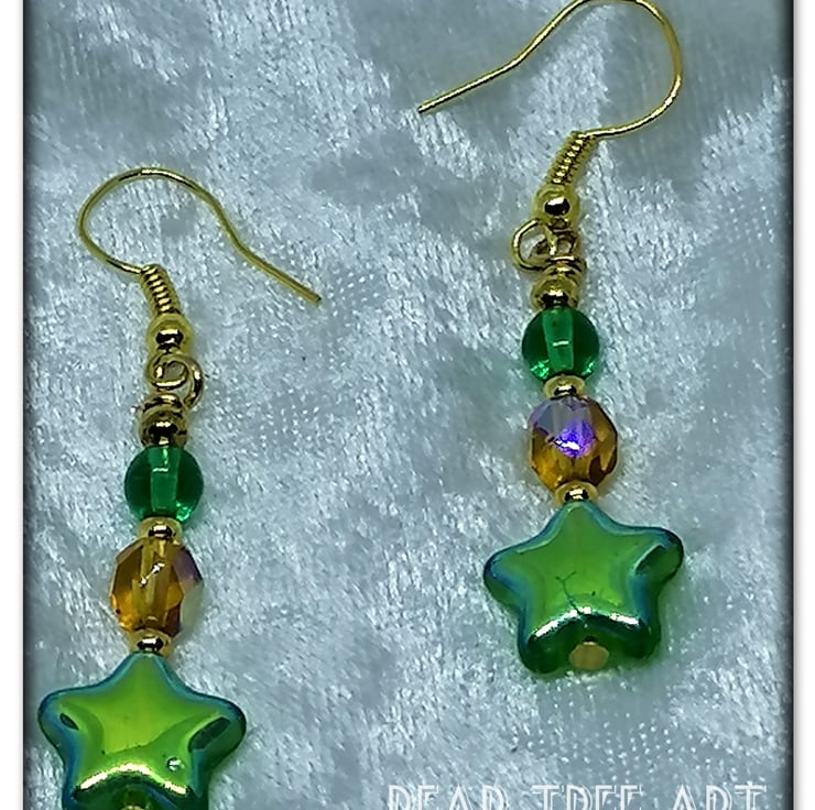 Green glass star bead earrings with amber crystal beads on gold plated hooks.