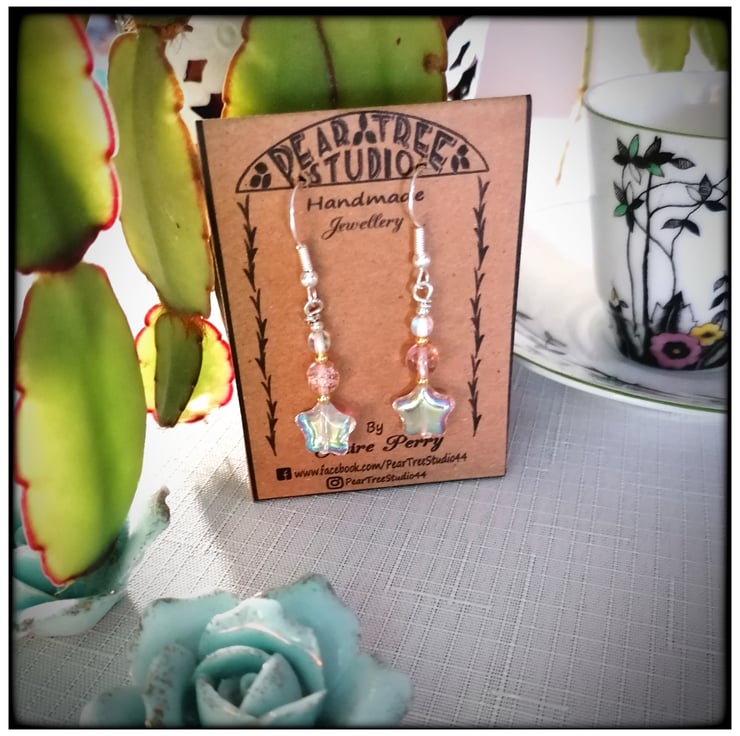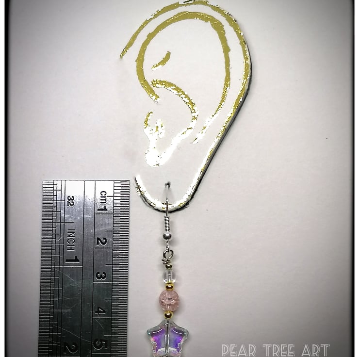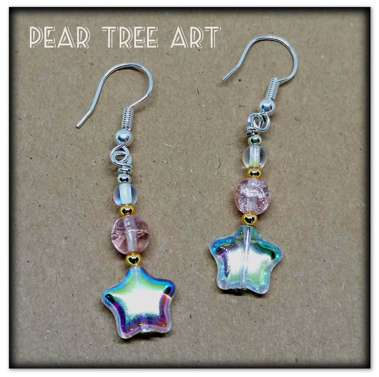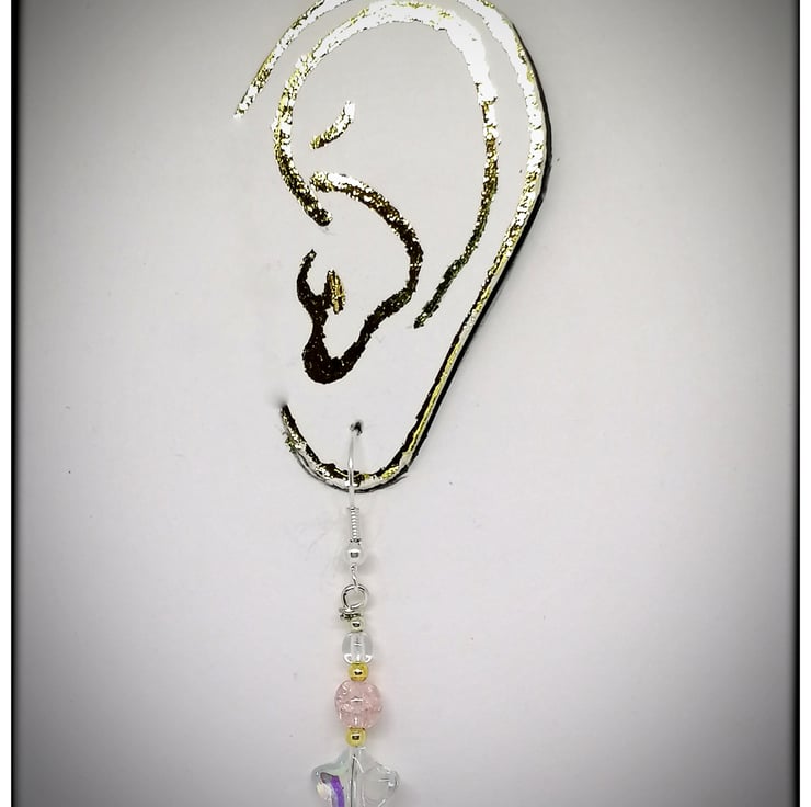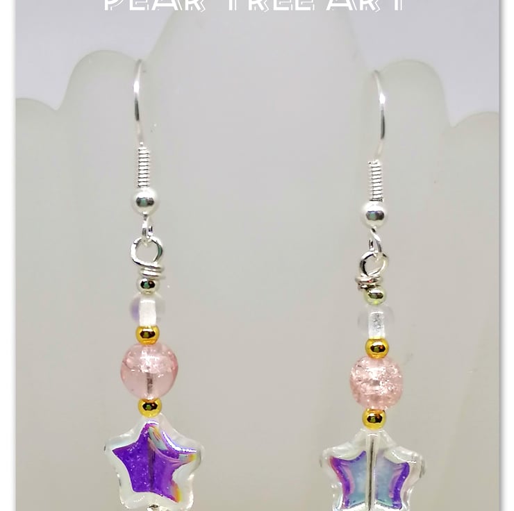 Clear glass star bead earrings with pink beads on silver plated hooks.