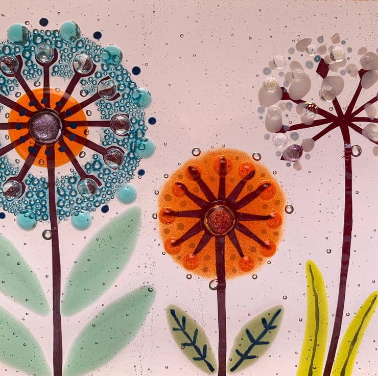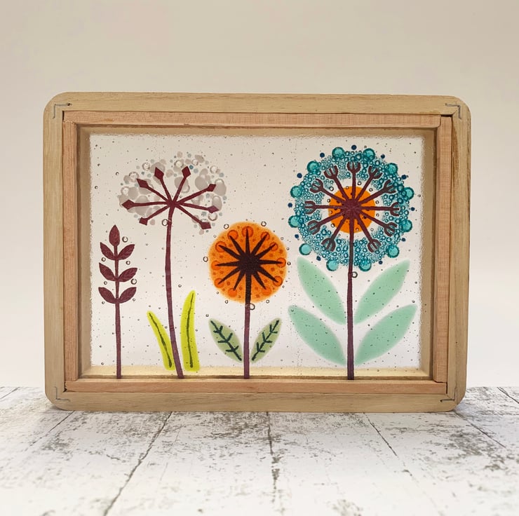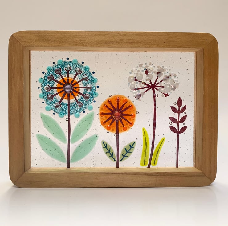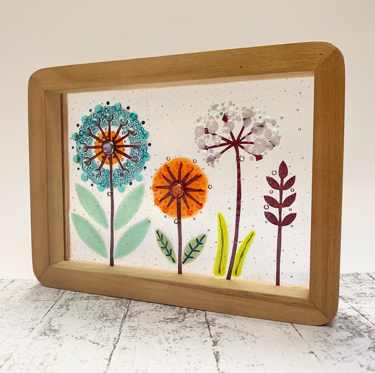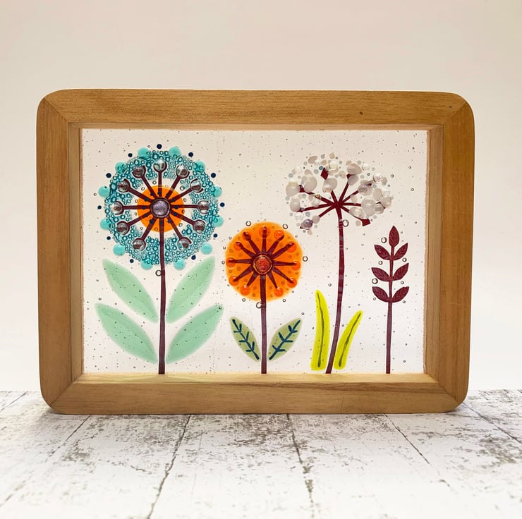 Fused glass freestanding piece in a chunky wooden frame. Inspired by my love of nature and wildlife, this piece features flowers inspired by alliums and meadowsweet, in shades or orange, turquoise and white. This would make a beautiful gift to put on a window sill to add some bright colours to the view.