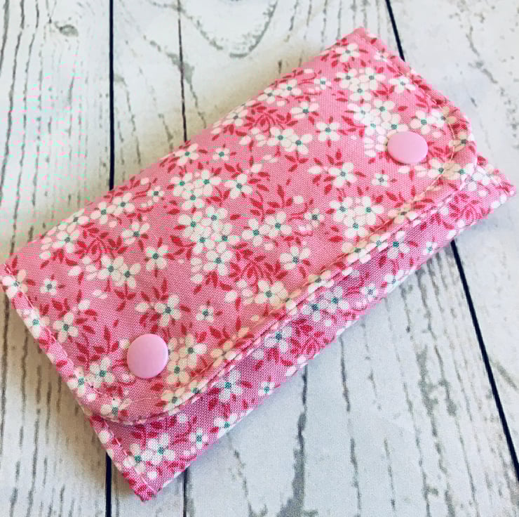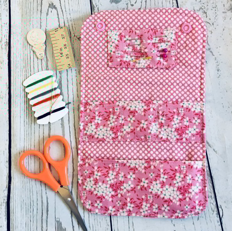 A mini sewing kit which fits neatly in your handbag, it includes scissors, thread, pins, needles, a tape measure and needle threader, each has there own place.