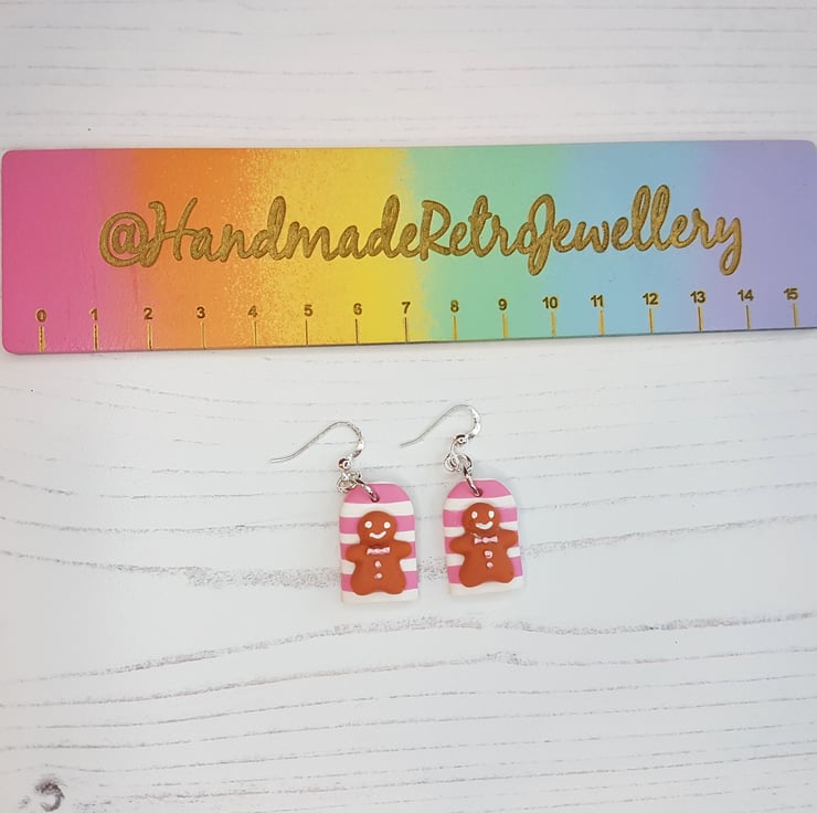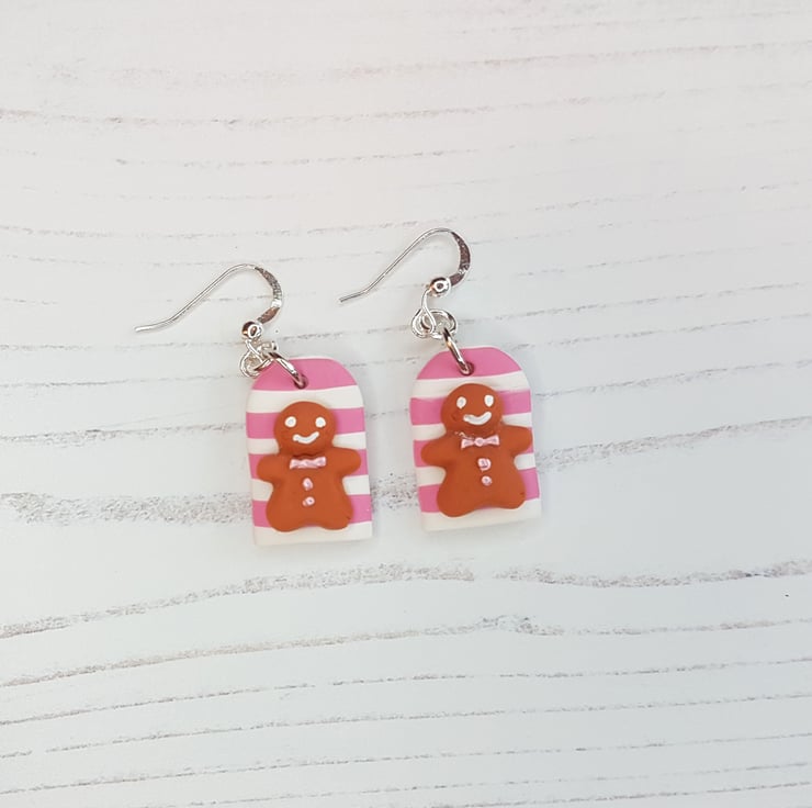 These beautiful pastel coloured striped earrings have been carefully hand crafted using polymer clay, with a cute gingerbread man on each! Final detail is hand painted using acrylic paint and a pearlised pink for the bow and buttons!