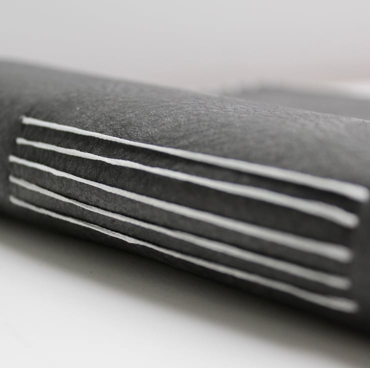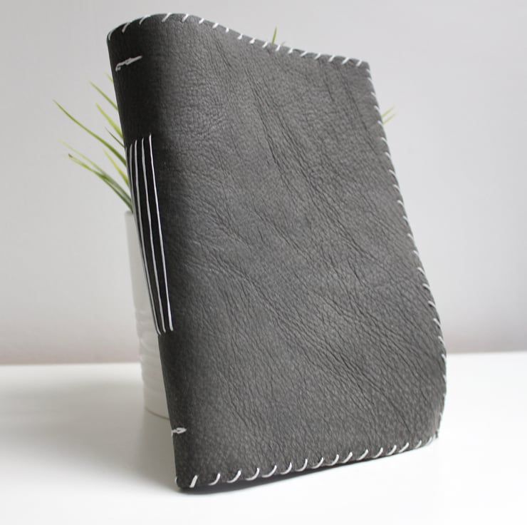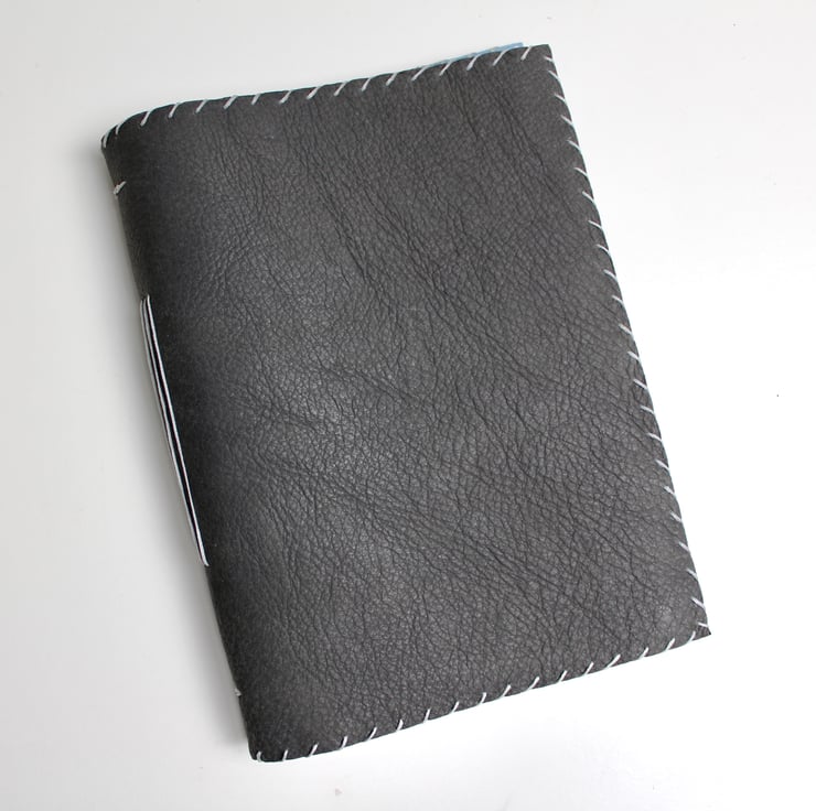 A beautiful brushed grey leather with a lovely pale blue with small white spots fabric lining. The notebook is hand stitched around the edge with a silver coloured thread and contains 200 sheets of quality lined paper which are then hand stitched to the leather in 5 signatures.