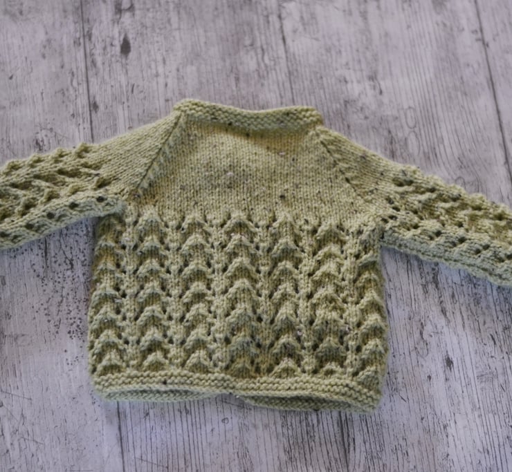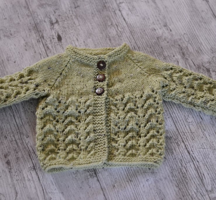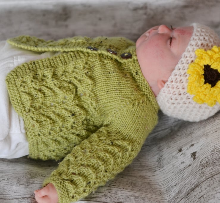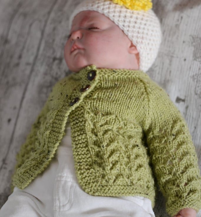 Lovely hand knitted cardigan in a gorgeous shade moss green with brown, cream and black flecks. Fits newborn babies . The shade is seen best on my reborn doll. Acrylic with 25% wool fibres. Machine washable at 30'. Fastens with3 coconut shell buttons. The bottom part of the cardigan is knitted in a lacey pattern.