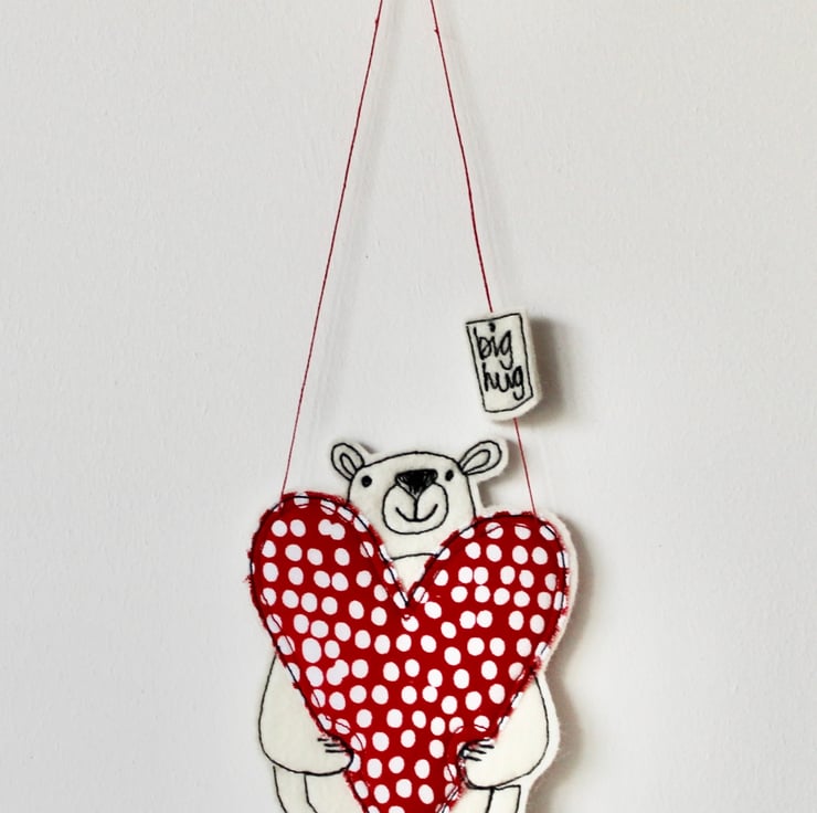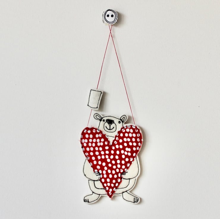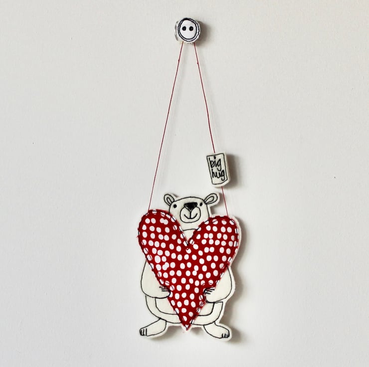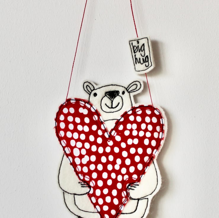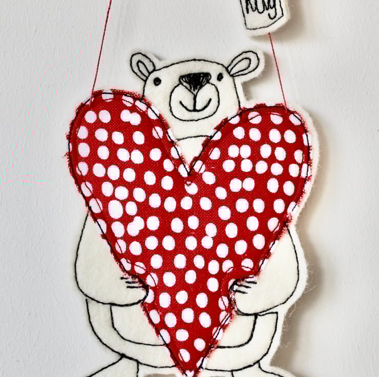Mr Bear is created using free hand machine embroidery, 100% wool felt, cotton cloth printed with dots and red linen string to hang. Multiple layers of cloth are sewn together and cut out by hand, using a very sharp pair of scissors.