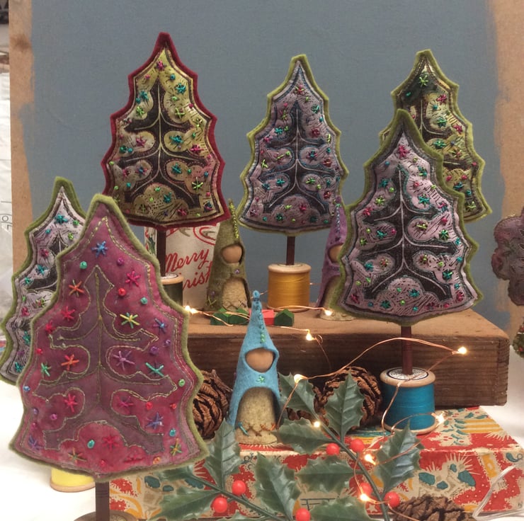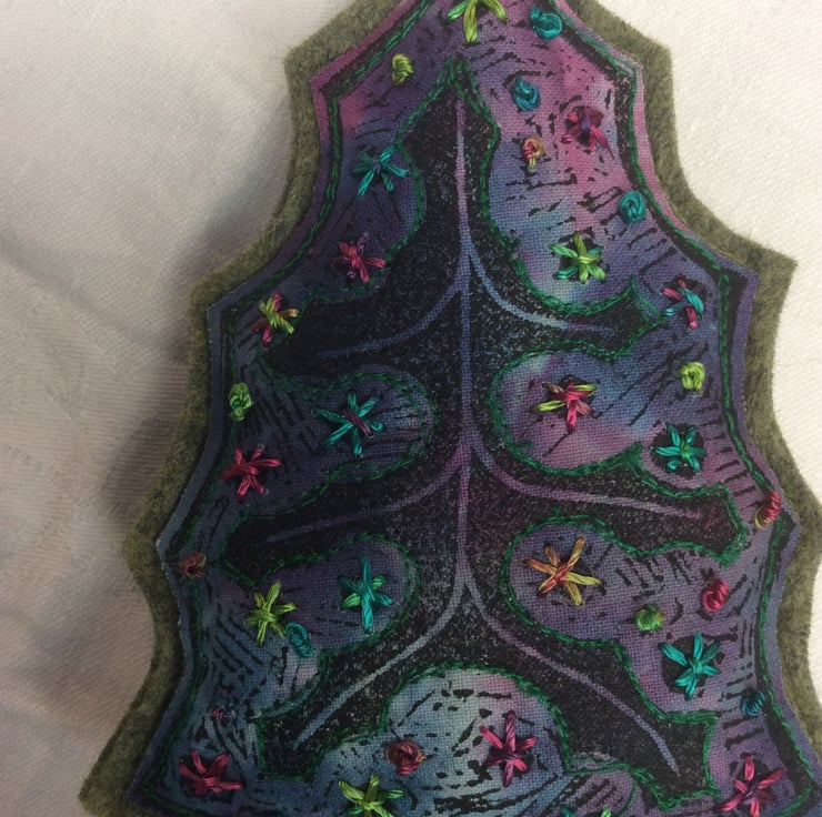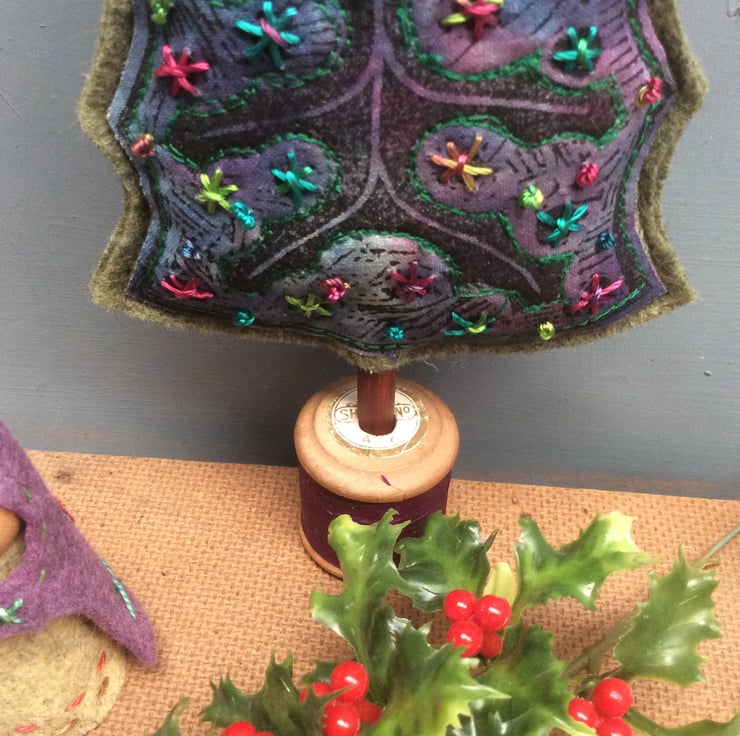 Part of my range of hand made trees, these were one of the first things I made. It’s a lino print on my own hand dyed fabric, so each one is completely different! I then freemotion stitch around the lines and finish odd with hand embroidery.