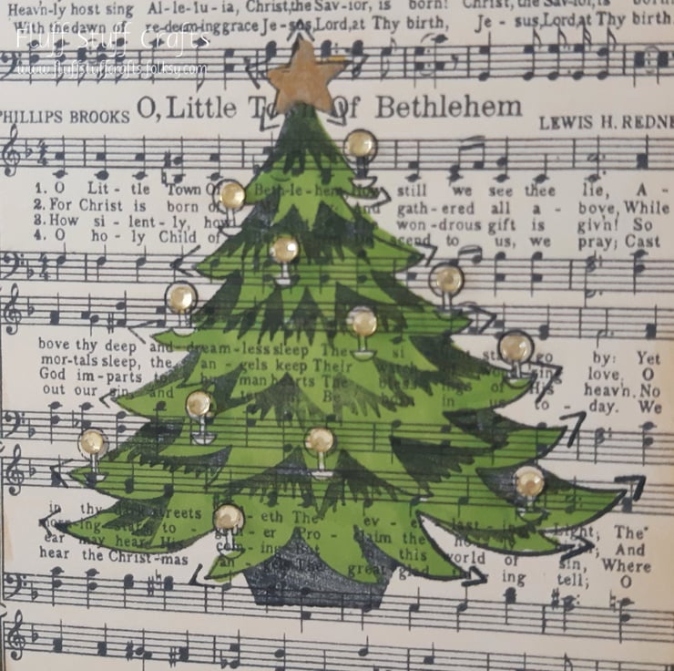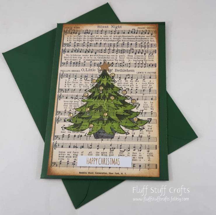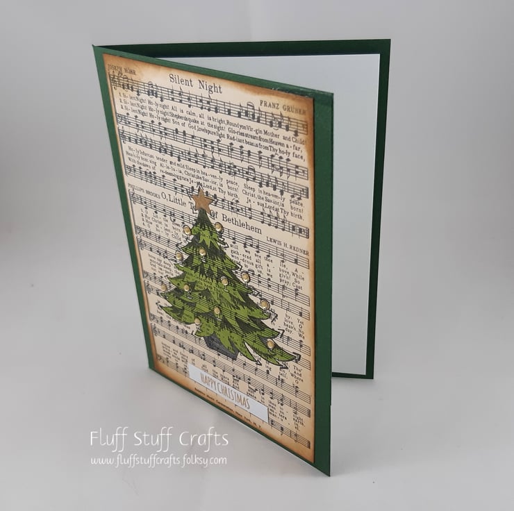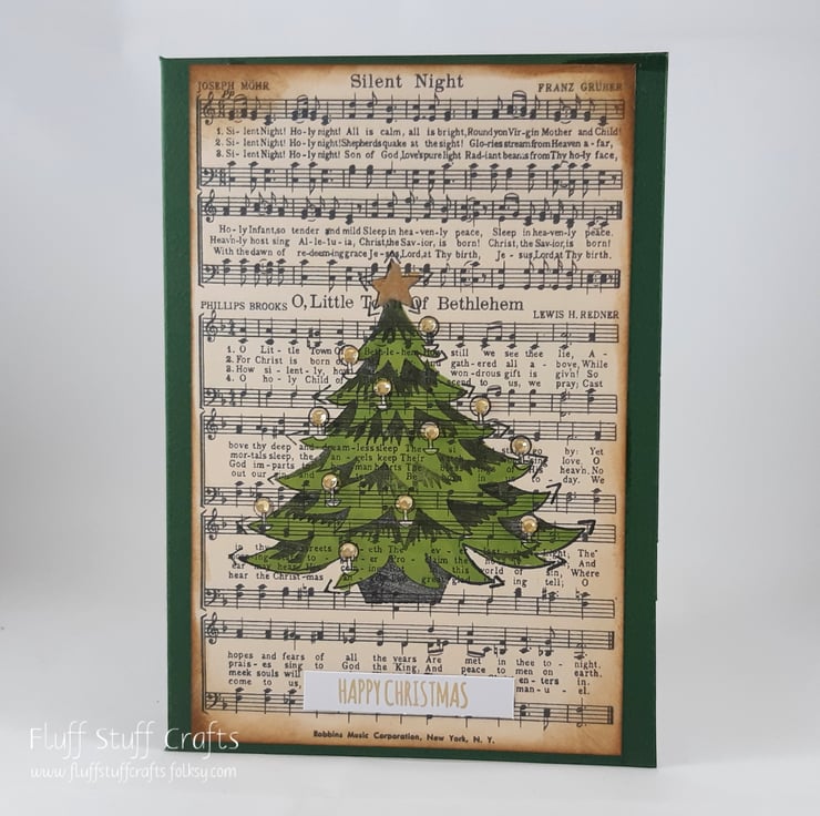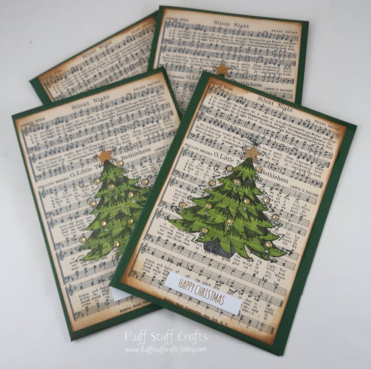 This pack of 4 handmade Christmas cards all feature a hand stamped and coloured Christmas tree on a sheet of Christmas Carols music paper which has been distressed for a vintage look. The lights on the tree have been given a bit of sparkle with a small gold gem. Each has the sentiment 'Happy Christmas' in gold foil on white cardstock, below the tree.