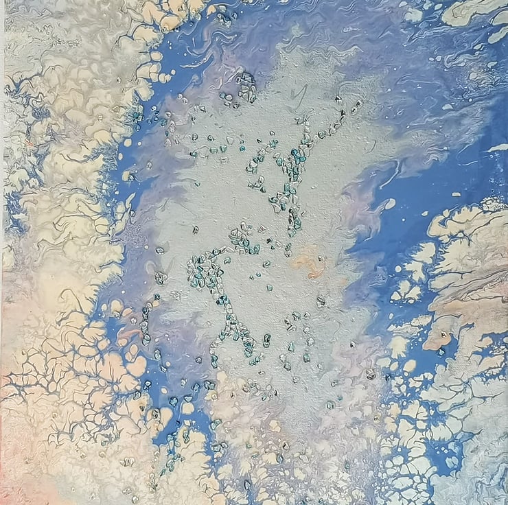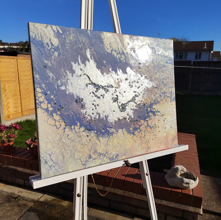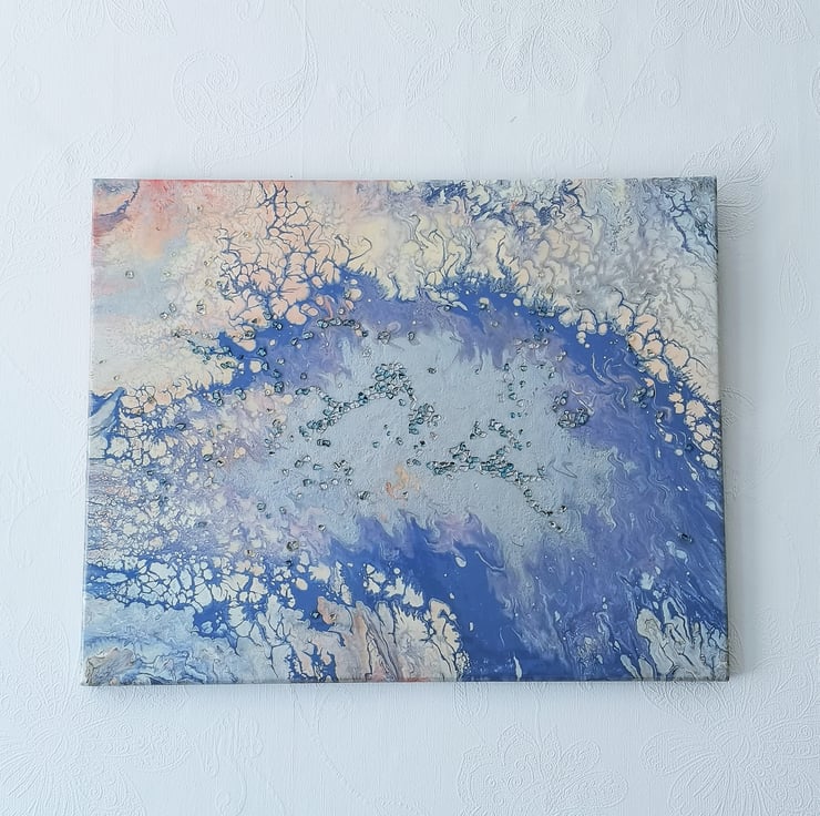 Technique: Acrylic Pour on canvas embellished with Silver and Blue Glass Crystals