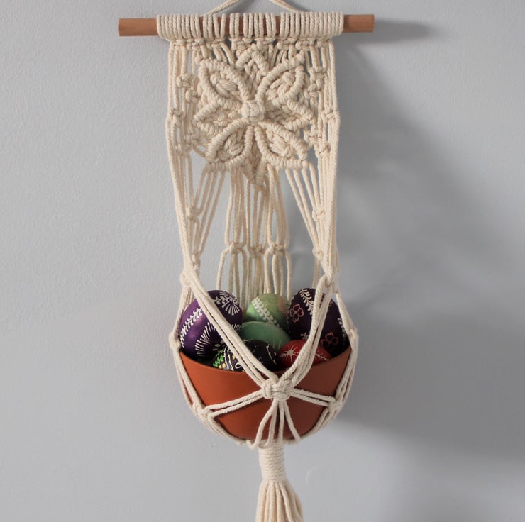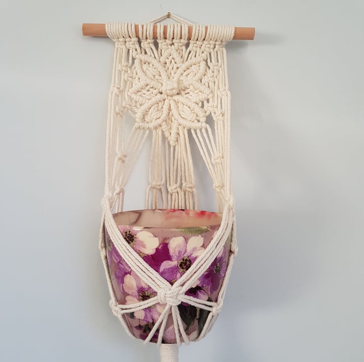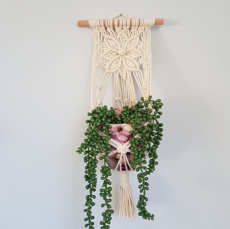 A macramé potholder created to make an eye catching display for your plants on the wall. A flower sits in the middle of the design, whilst below, your plant can cascade over the sides of the basket. The hanger is tied to a 20cm x 1.5 cm wooden dowel, it has been made using natural twisted cotton.