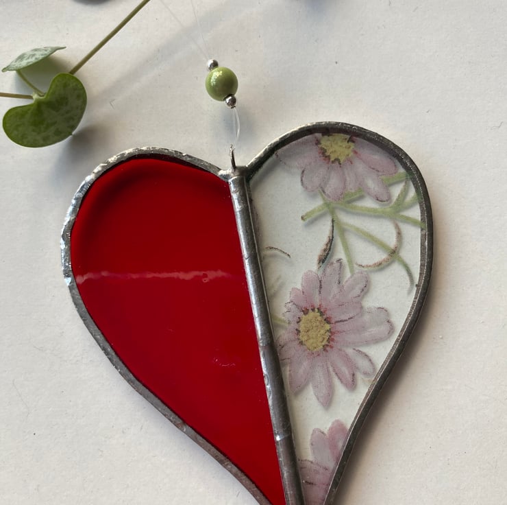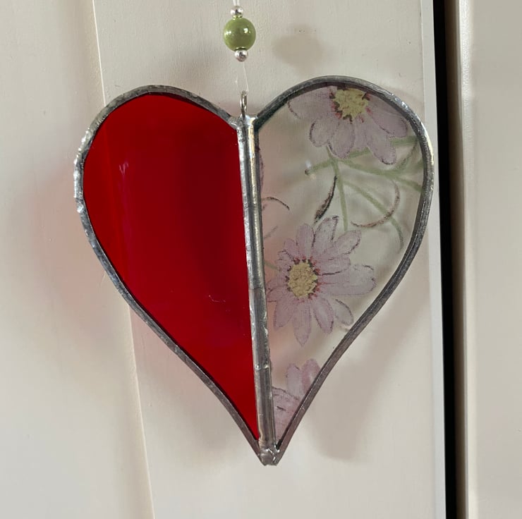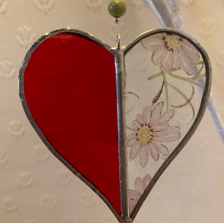 A beautiful 2 tone stained glass heart made using the Tiffany ( copper foiled ) method of stained glass . Each half is a different colour , (Red,clear with pink flowers)