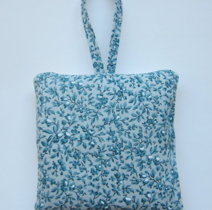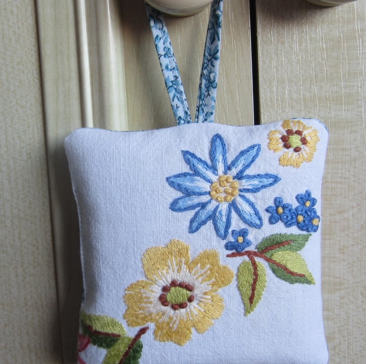 Hanging lavender sachet with a vintage embroidered flower and leaf design front in blue, yellow and green colours. The back and loop are in a coordinating blue floral fabric.