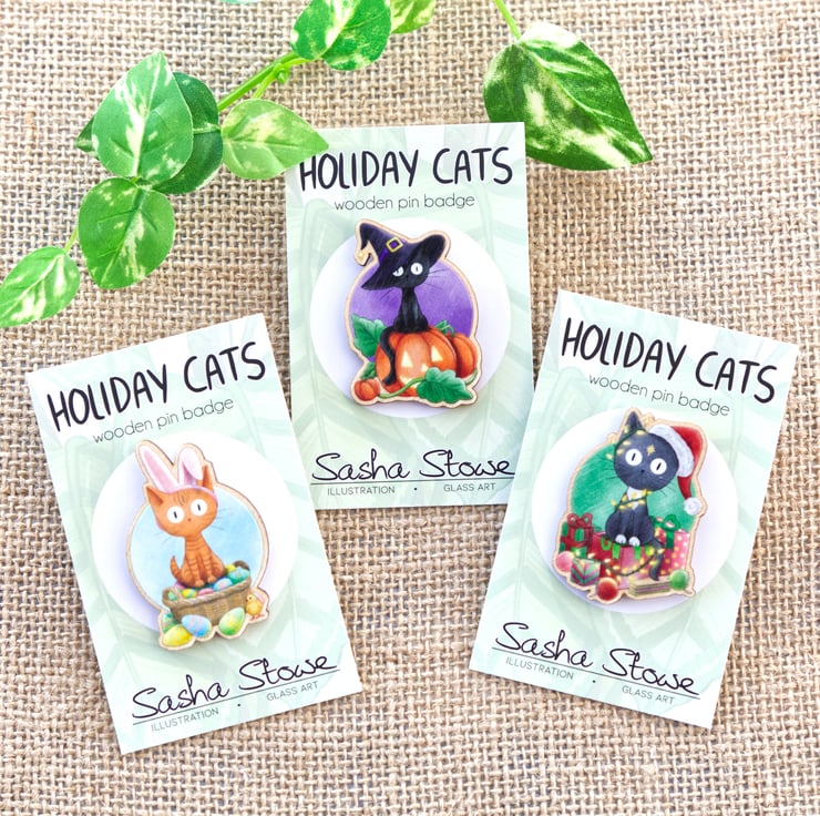 The badge measures approximately 4cm by 3cm and comes with a rubber closure and on a card as shown in the pictures. Two other designs in the range are available as shown, a Halloween and Easter cat, please have a look at my shop to see. This design is also available as a card, print and tote bag.