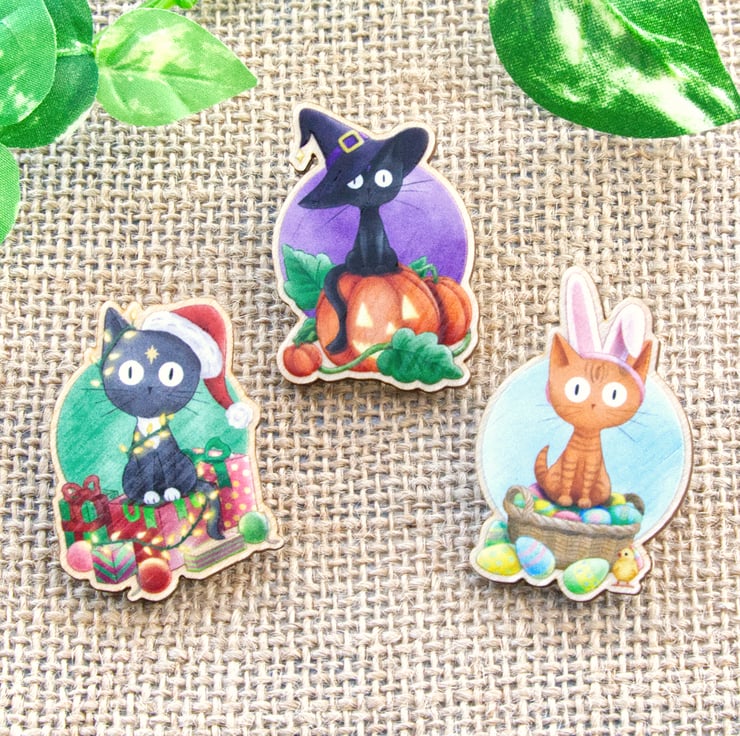An adorable little wooden pin badge with an illustration of a Christmas kitty. It would make the perfect little gift for any cat lover, for a stocking filler or secret Santa gift.
