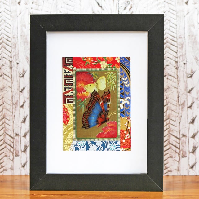 I bought a pair of vintage butterfly cards and couldn't resist using one as the focal point in this mini collage. I love the vibrant blues and reds and have used this colour palette in the rest of the collage.