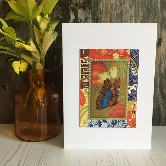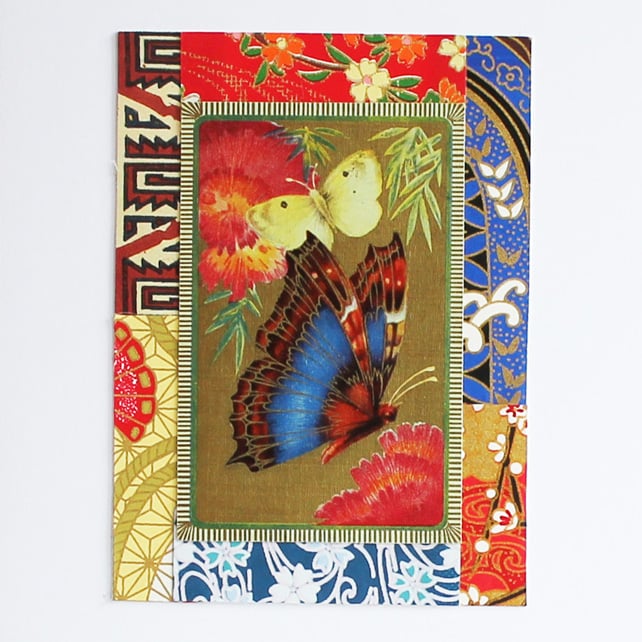 In the centre is a vintage playing card featuring two butterflies and flowers on a metallic gold background. I've used a selection of Japanese origami papers and patterned papers from old books to frame this and create a rich tapestry effect. Some of the origami papers also have metallic gold in them which adds a bit of sparkle.