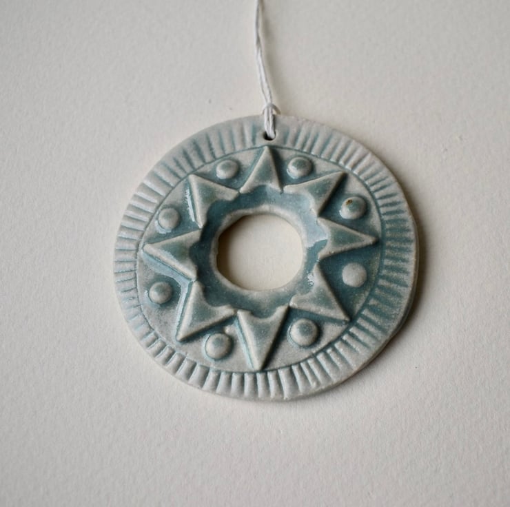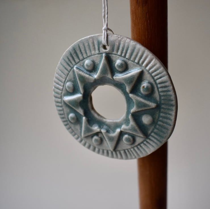 The green glaze on this decoration breaks pleasingly over the 3D applied decoration on this Scandinavian inspired decoration.