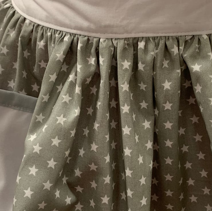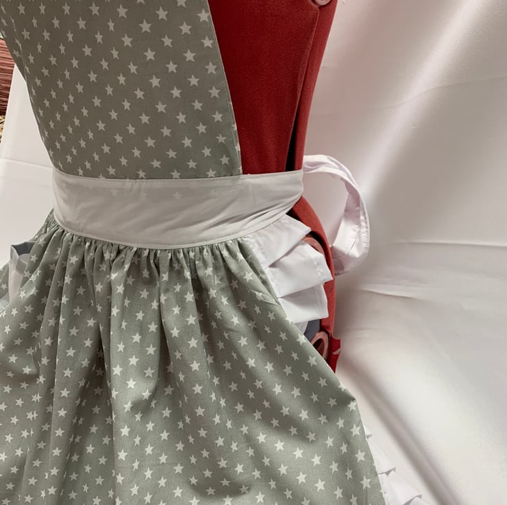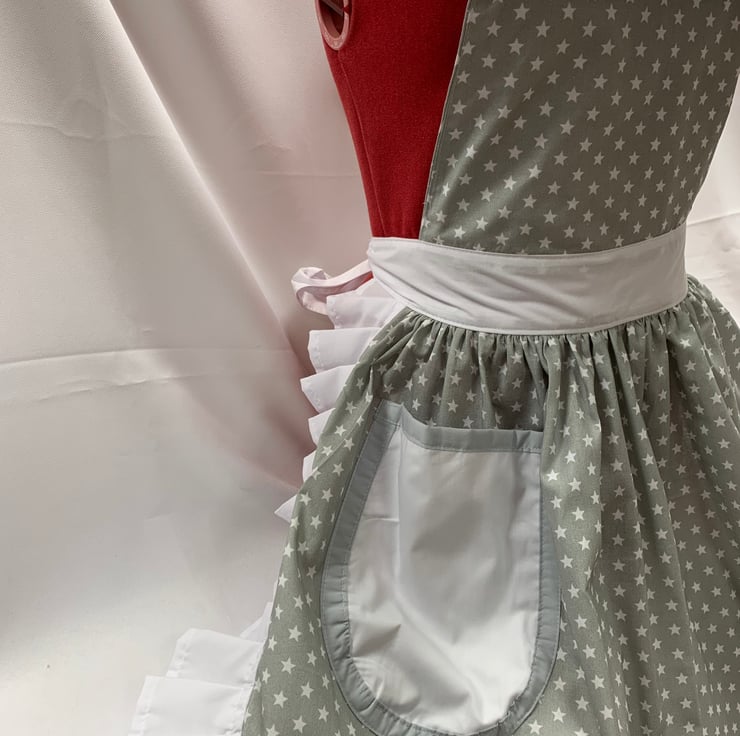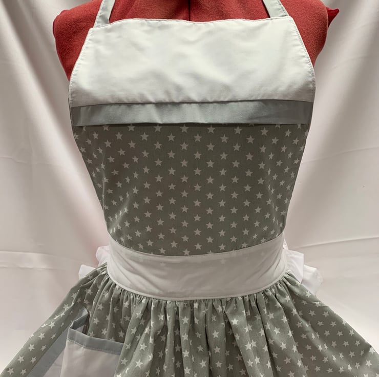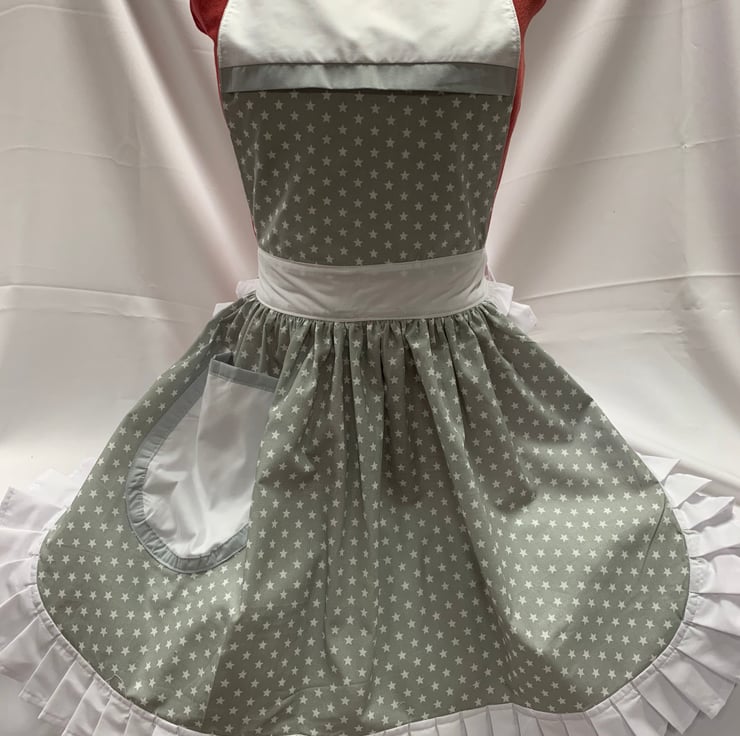 Here we have a lovely cotton rich, silver / grey with white stars and white trim retro style apron, handmade in house to our own design. (see photos). Adjustable neck and waist ties so will fit up to a size 22.