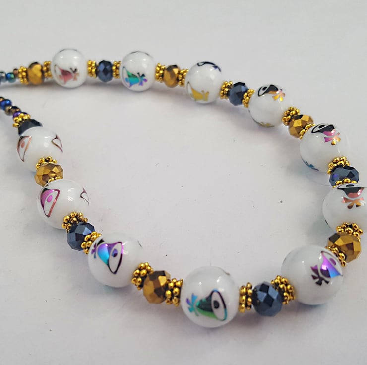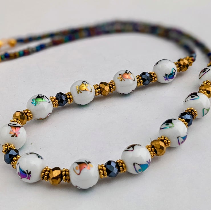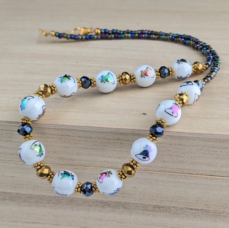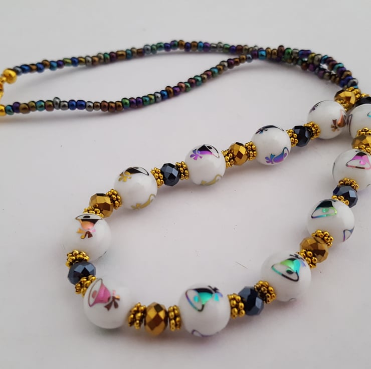 18.5" necklace of 10mm white opaque glass beads with metallic Christmas bells design, and 6mm sparkly (AB) faceted glass beads in gold and black, with iris lustre seed beads and Tibetan gold daisy spacers. In an organza gift bag.