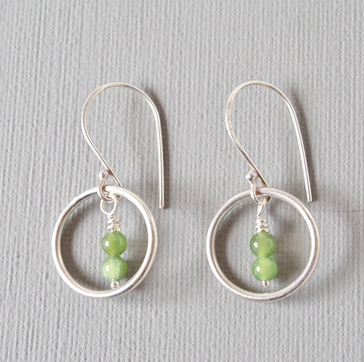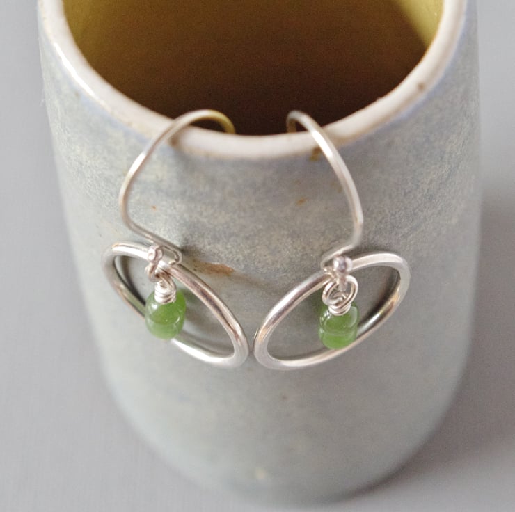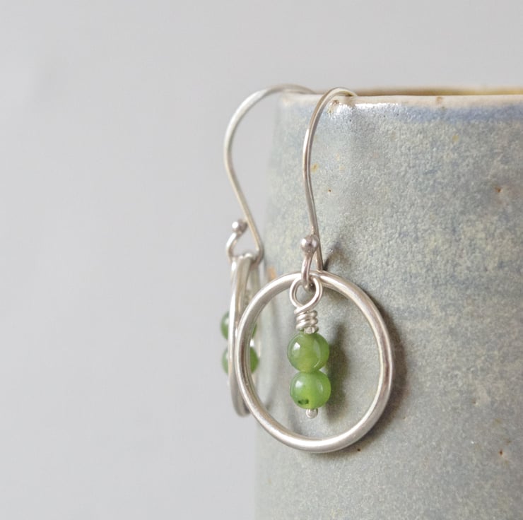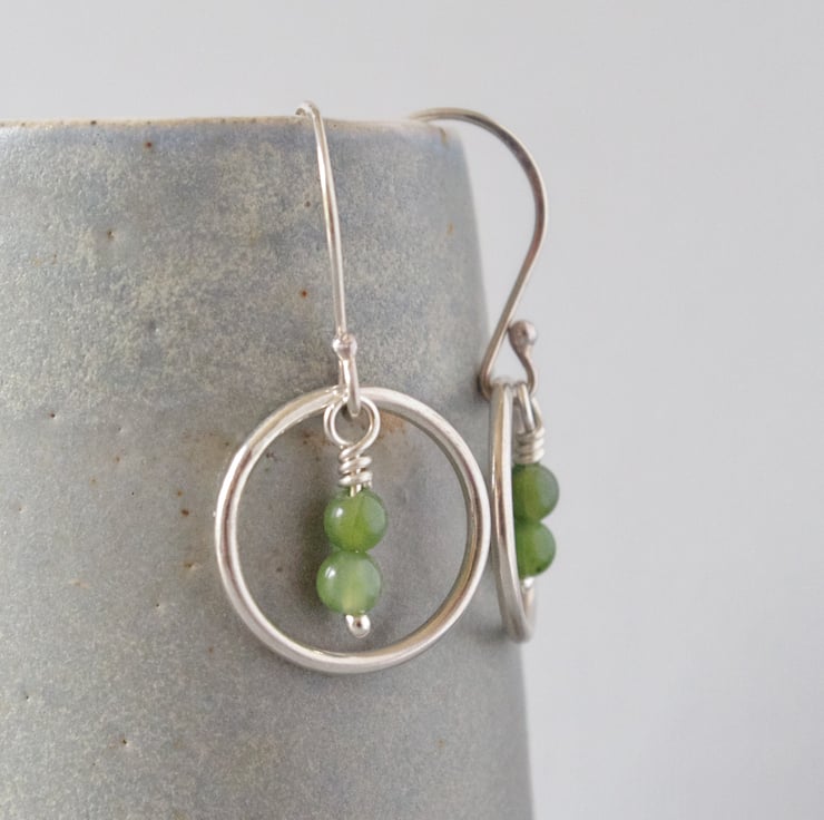 Leafy green nephrite jade beads hang gracefully like budding flowers within these highly polished circular sterling silver drop earrings. This is the natural undyed colour of these semi-precious beads and is actually my favourite. The translucent gems have small dark flecks which enhance the natural feel of these beads. The silver hoops represent the solar and lunar cycles and also the principle of karma, the contrasting shapes interacting to produce contemporary geometric jewellery. The wirework featured in my minimalist design is hand made by me in my West Sussex workshop. These earrings measure approximately 34 mm or 1 3/8" in length and the final photograph shows them with a 3" long vintage lipstick case to provide a sense of scale.
