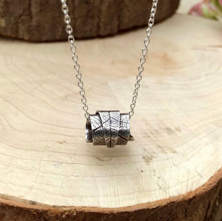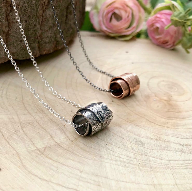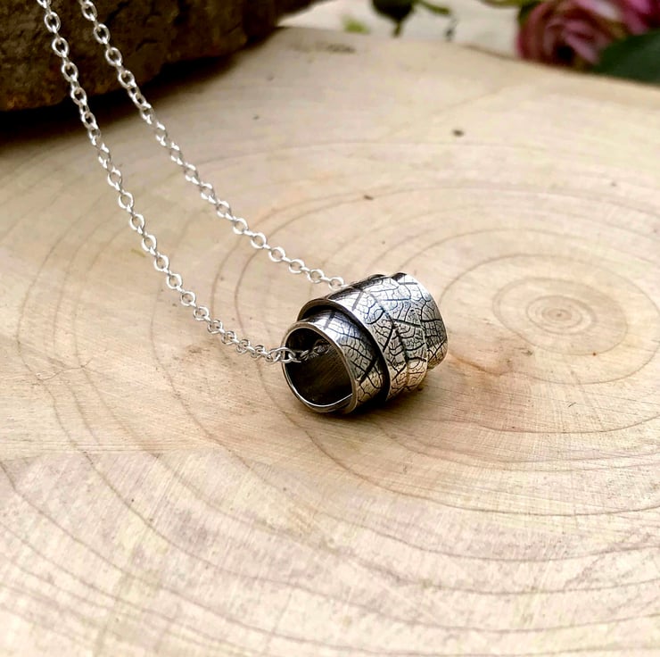 This handmade sterling silver necklace features the actual impression of a leaf, imprinted into the meal and coiled to create a curled leaf pendant.