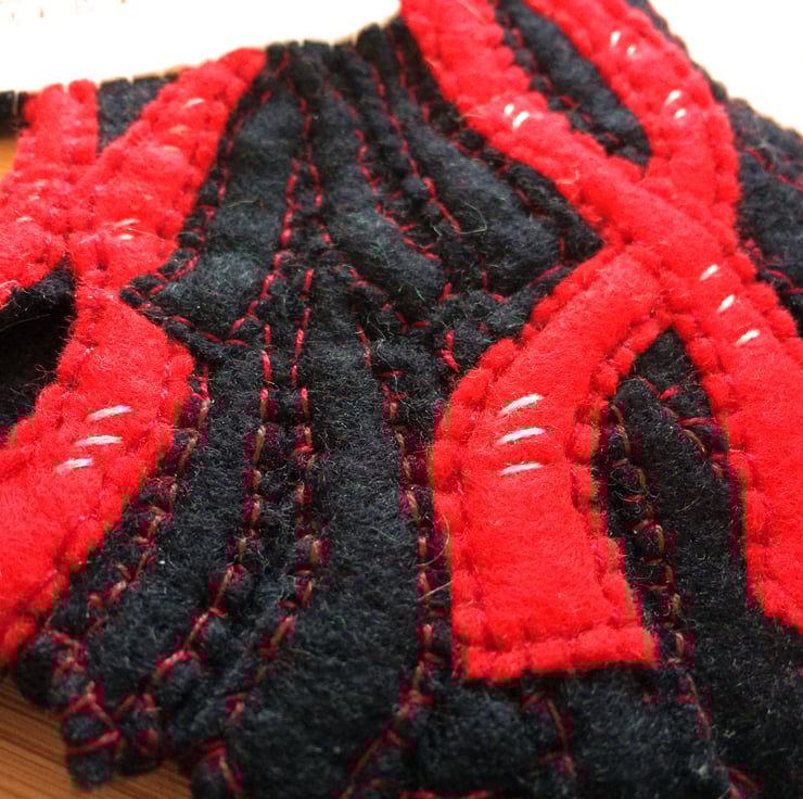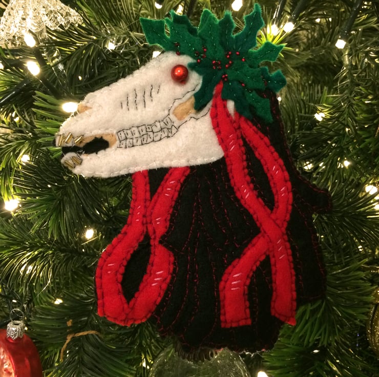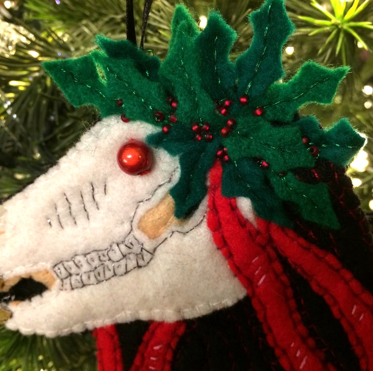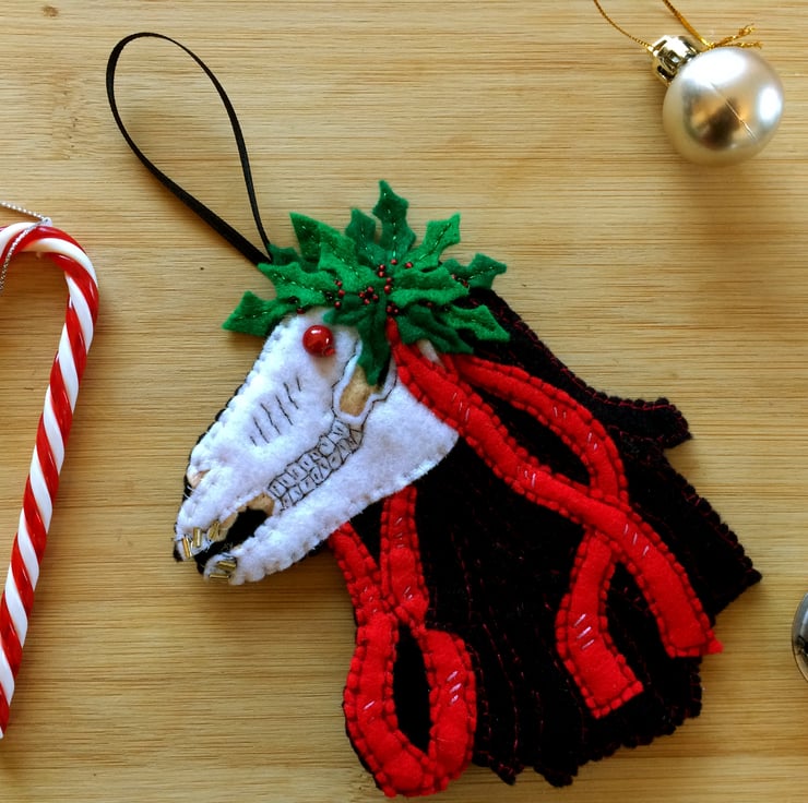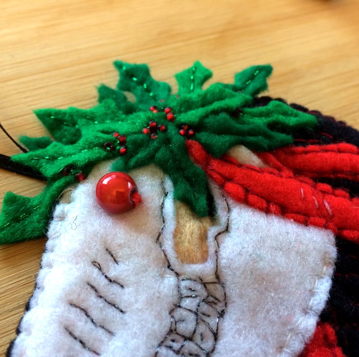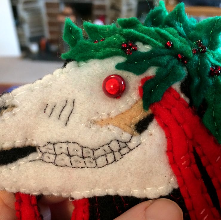 Hand sewn and hand beaded, one-sided depiction of the mast beast PenHood, (the oss constructed by Gemma Gary and Jane Cox for Montol Festival in Penzance). Made from acrylic felt, cotton, embroidery threads, metallic threads. Mouth full of gold coloured bugle bead teeth. Crowned with felt holly leaves and silver lined red bead berries, and a magic disco bead eye which reflects and appears to glow under certain lighting.