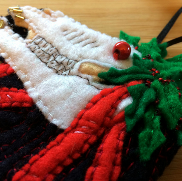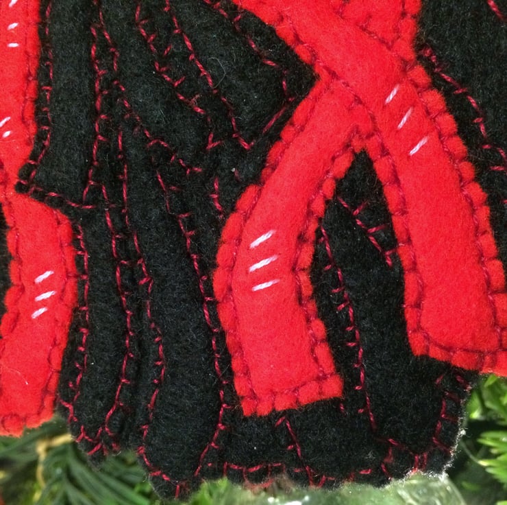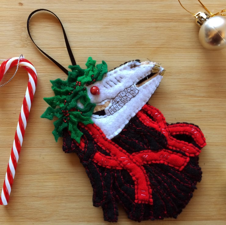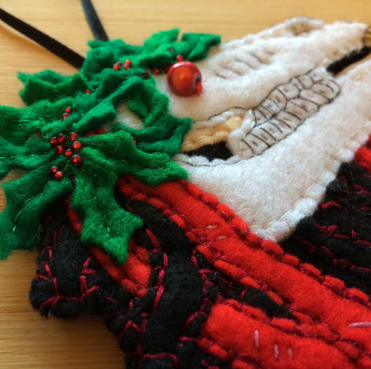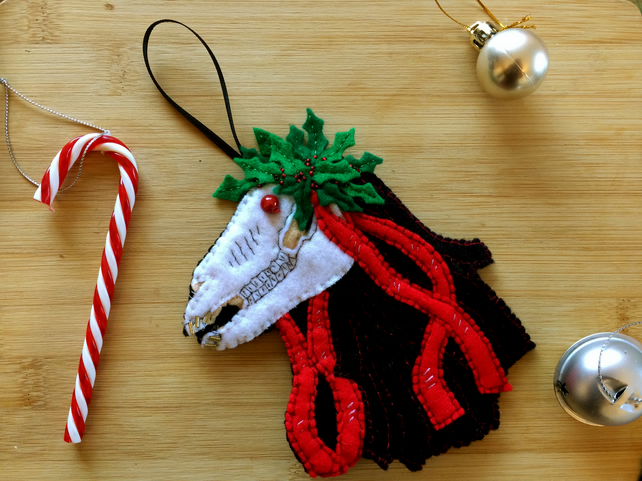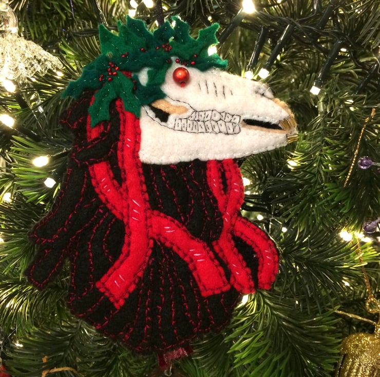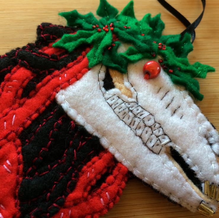 This listing is for a pair of hand sewn and hand beaded one-sided depiction of the mast beast PenHood, (the oss constructed by Gemma Gary and Jane Cox for Montol Festival in Penzance). Made from acrylic felt, cotton, embroidery threads, metallic threads. Mouth full of gold coloured bugle bead teeth. Crowned with felt holly leaves and silver lined red bead berries, and a magic disco bead eye which reflects and appears to glow under certain lighting.