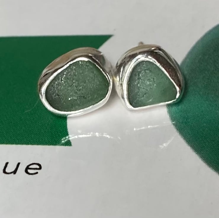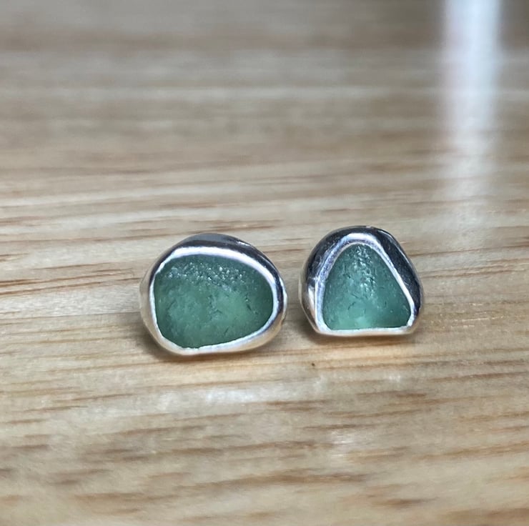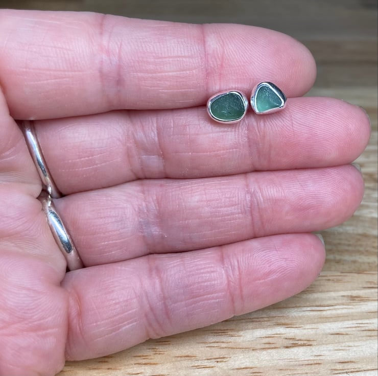 Gorgeous handmade green-blue sea glass and silver stud earrings, uniquely elegant!
