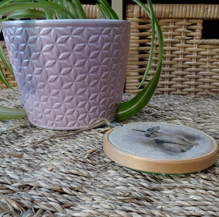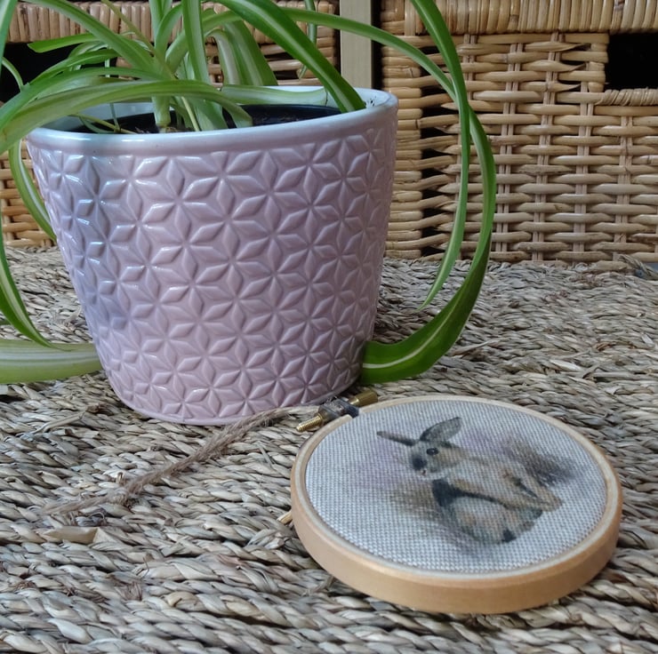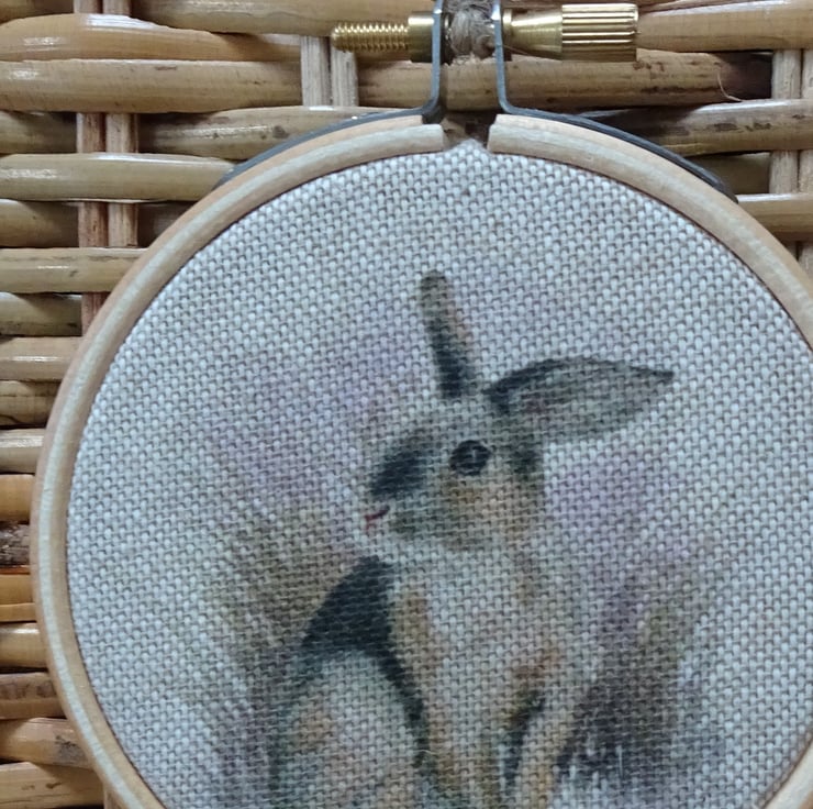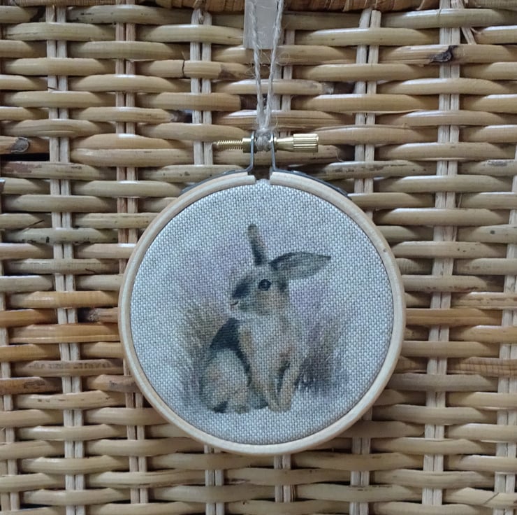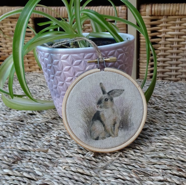 A cute mini hanging hoop with a rabbit, sitting in the grass printed on a beige background.