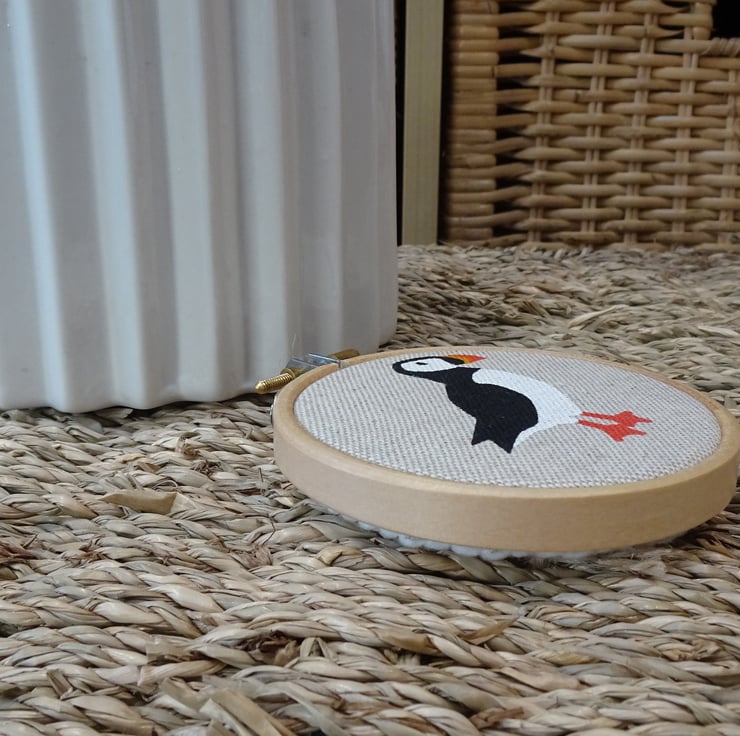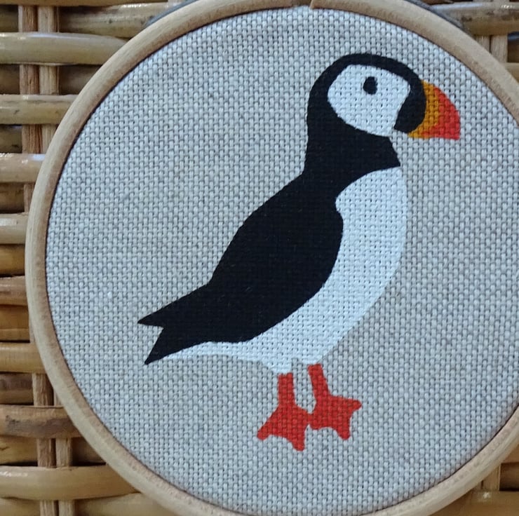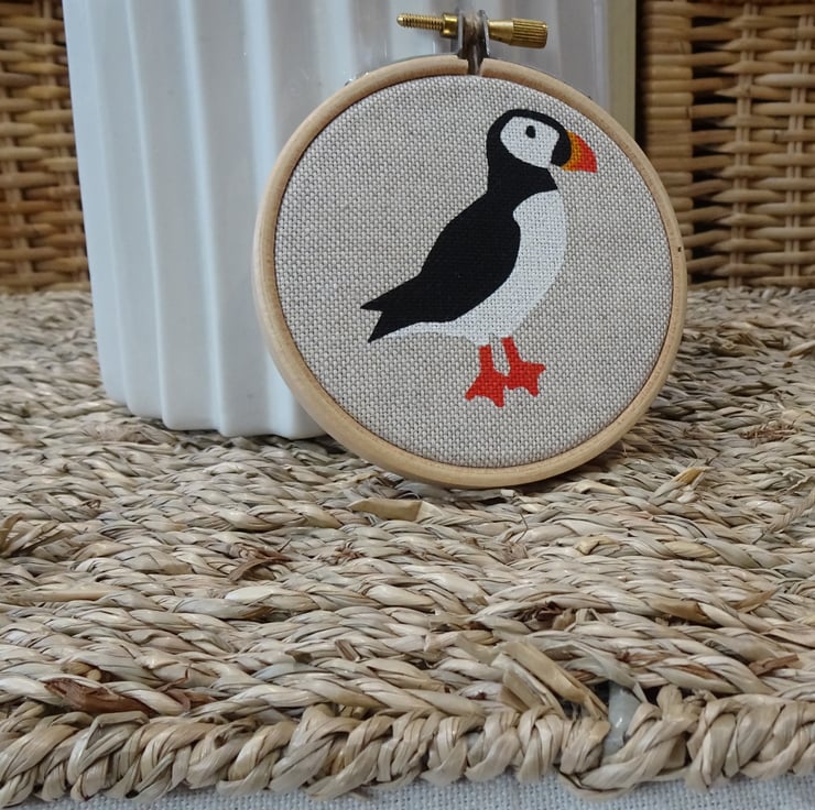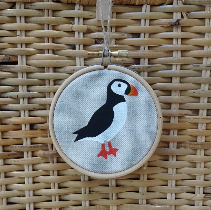 A cute mini hanging hoop with a black and white puffin printed on a beige background.