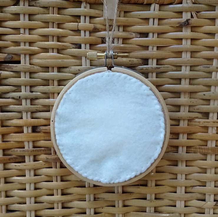 The wooden hoop measures approximately 3.3inches (8.5cm) across once finished and is hung with a length of twine approx 3.7 inches (9.5cm).