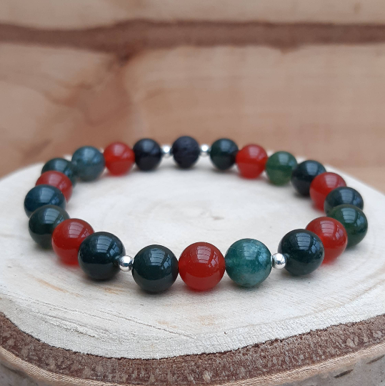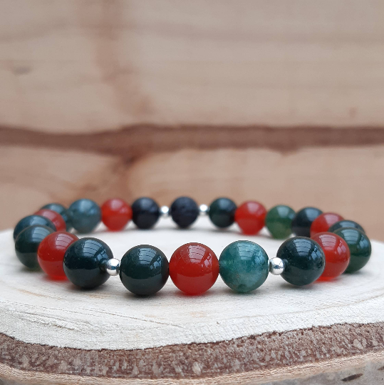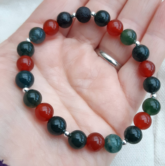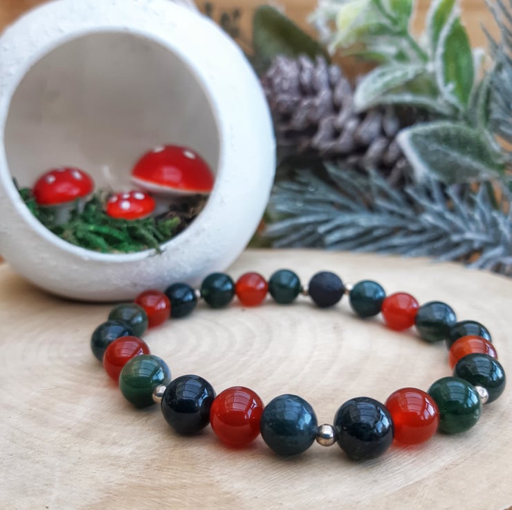 This bracelet is made from a selection of 8mm moss agate beads together with 8mm red carnelian beads and dainty 3mm sterling silver spacer beads - combined with a single 8mm black lavastone bead.