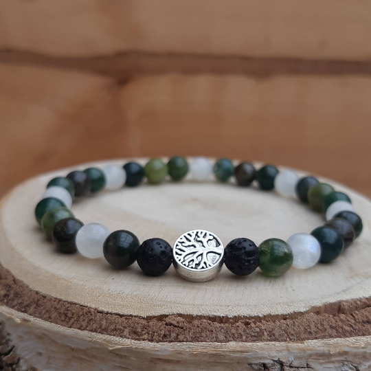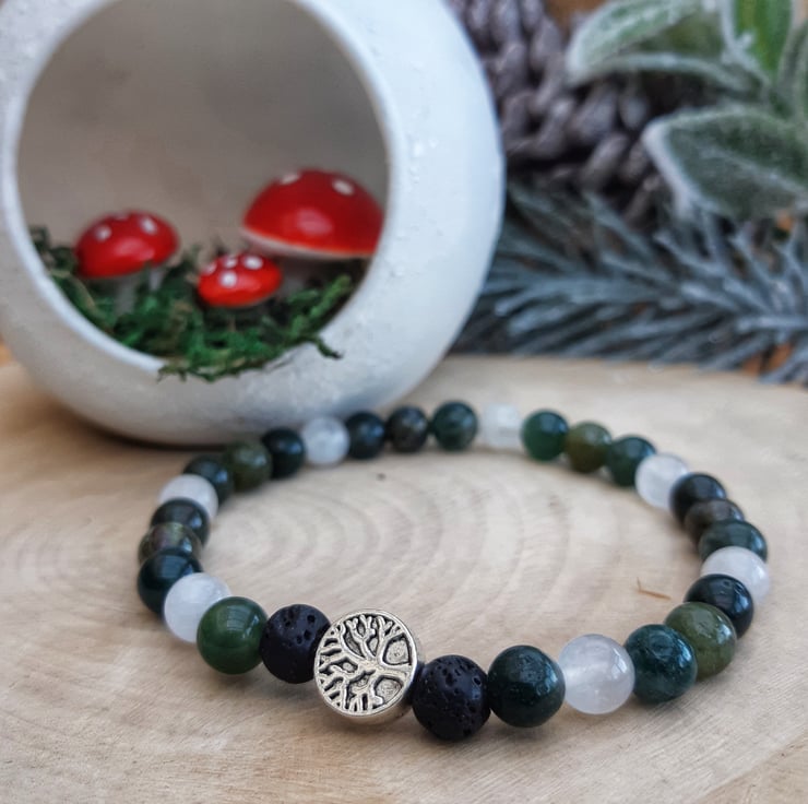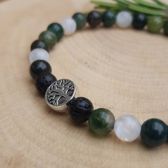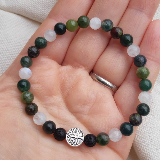 This bracelet is made from a selection of 6mm green gemstones interspersed with beautiful rainbow moonstone beads, together with 2 6mm black lavastone beads and a silver toned 'tree of life' bead (approx. 8mm diameter, made from zinc metal alloy (lead, cadmium and nickel free)).