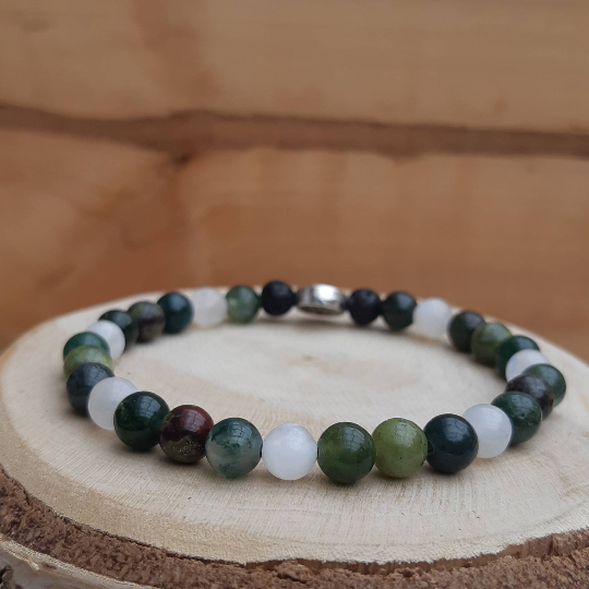 Moss agate features lovely deep green tones. It is said to bring abundance, success and prosperity. It is a protective stone, also associated with friendship.