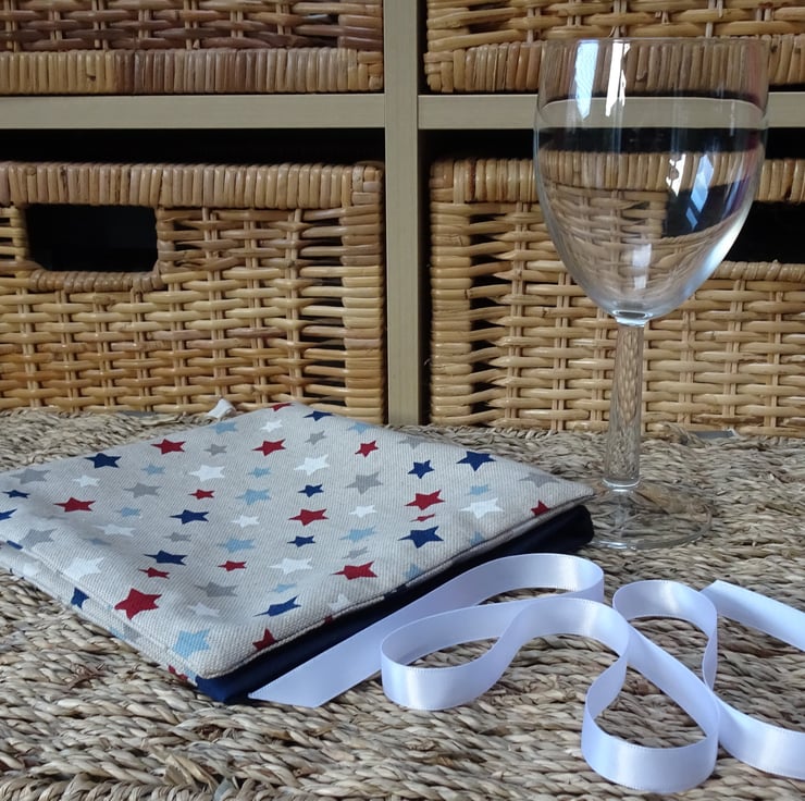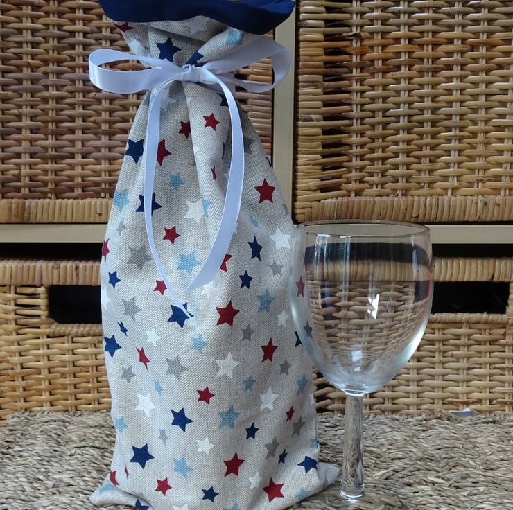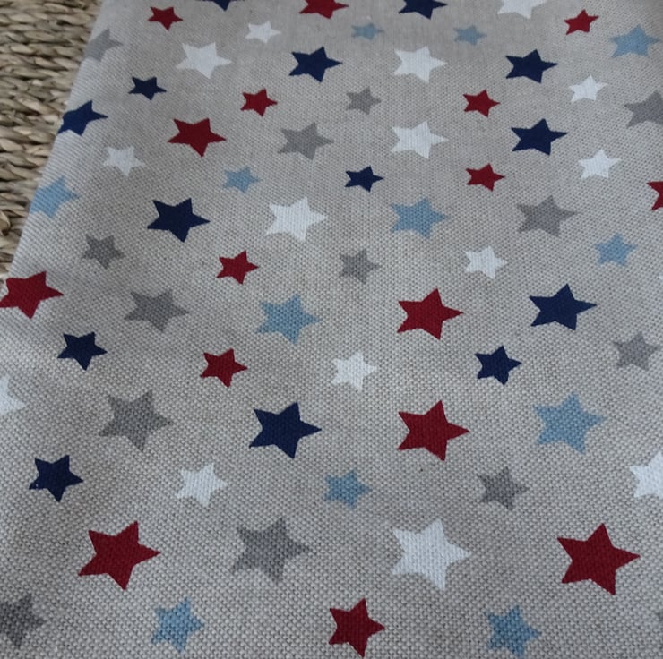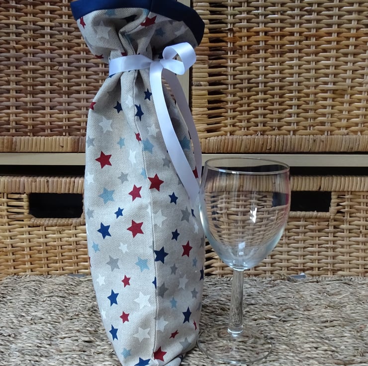 A multi-coloured stars bottle bag with blue, red, grey and white small and large stars on a beige background.