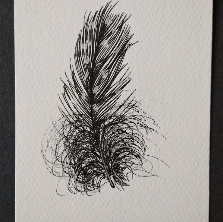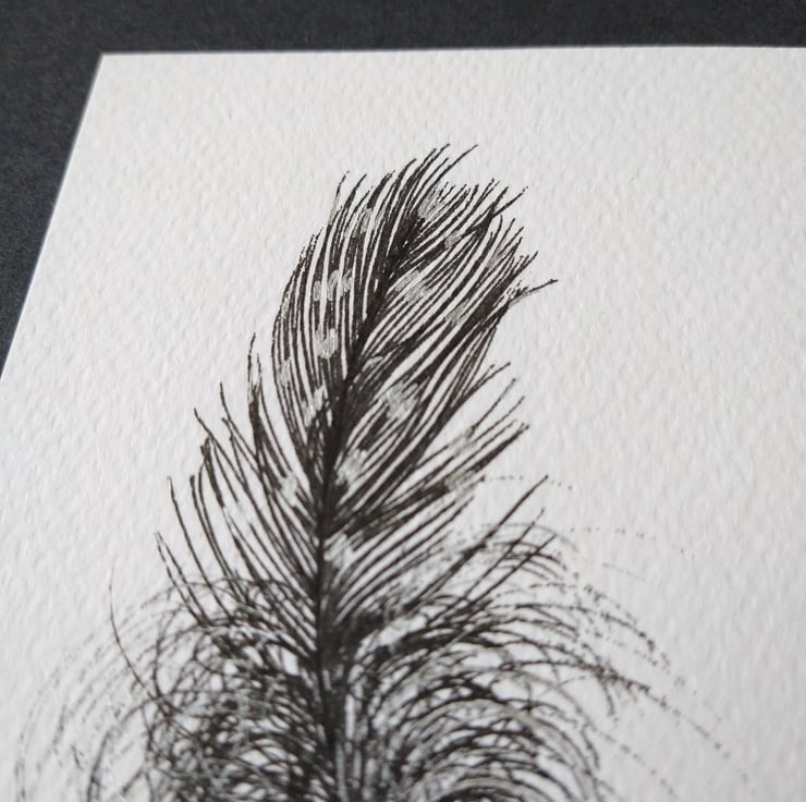 This small original drawing of a guinea fowl feather is worked in pen on watercolour paper with metallic silver spots. It's a small drawing, around 10 x 15 cm, and would make a lovely present or as a start to an art collection on a budget!