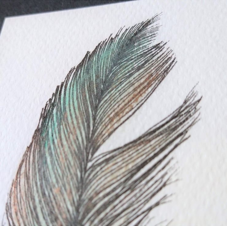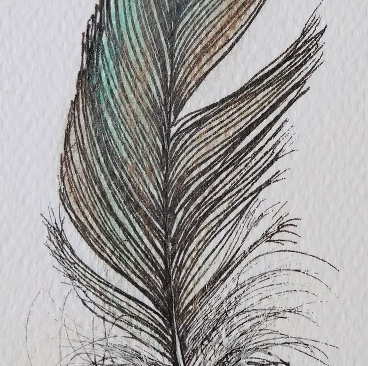This small original drawing of a feather is worked in pen on watercolour paper with iridescent pastels in green and gold worked over the top to capture the shine of the feather. When it catches the light it's just beautiful! It's a small drawing, around 10 x 15 cm, and would make a lovely present or as a start to an art collection on a budget!