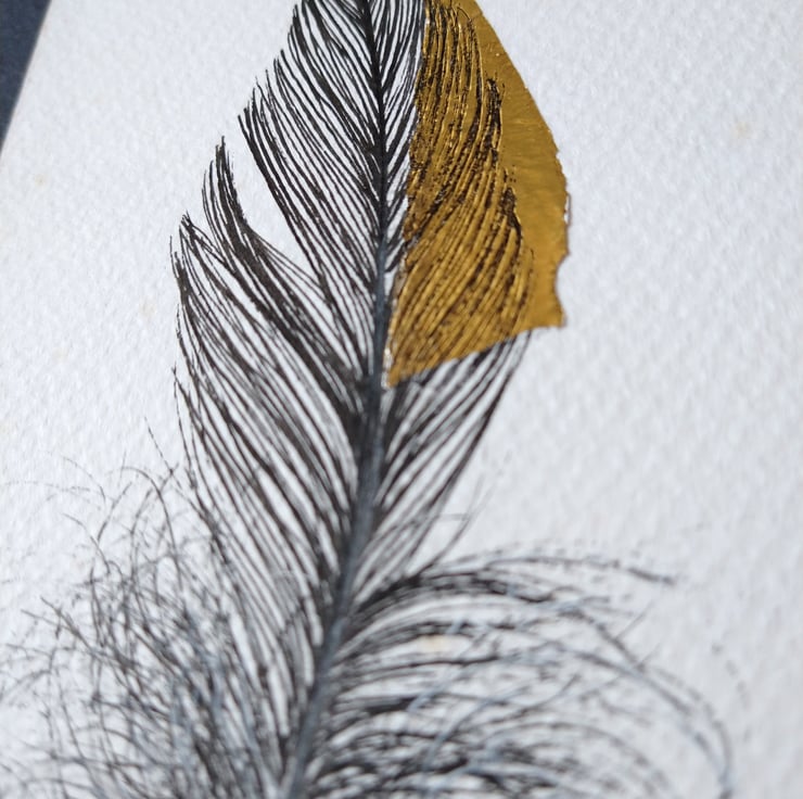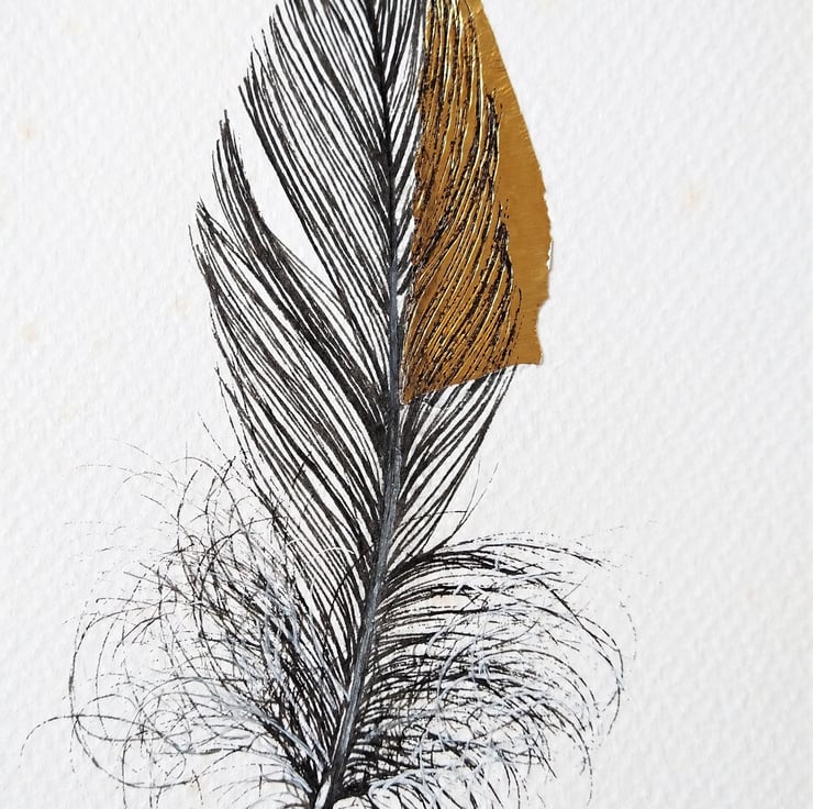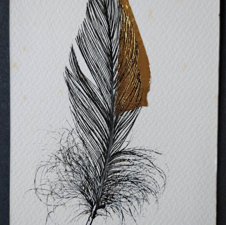 This small original drawing of a feather is worked in pen on a watercolour paper postcard with gold paper collage It's a small drawing, around 10 x 15 cm, and would make a lovely present or as a start to an art collection on a budget!