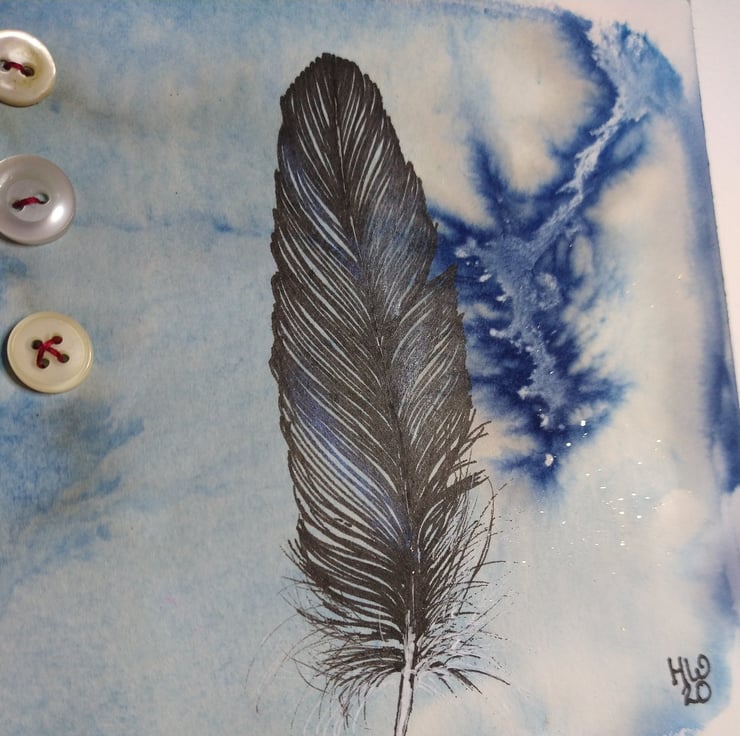 This small original artwork features one of my hand drawn feathers, complete with shimmering iridescent pastel, and three buttons sewn onto a coloured cardstock background. There's also a subtle sprinkling of gold which catches the light beautifully. The background colouring was achieved via a slight miscalculation with my cyanotype chemicals; I didn't get the effect I intended but I did get a beautiful blue surface to work on!