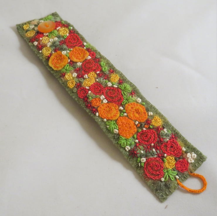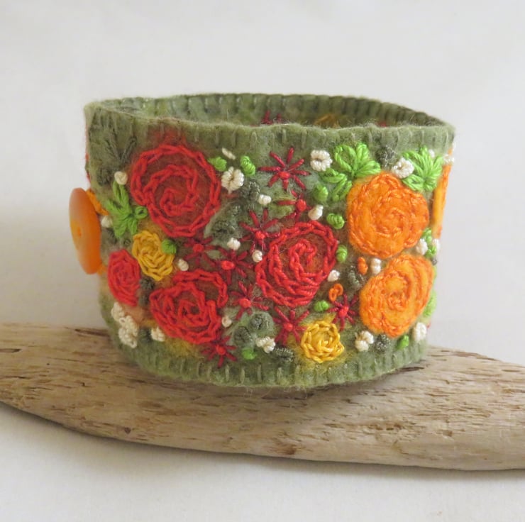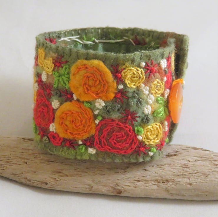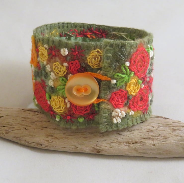 This pretty cuff is felted and embroidered onto a felt background, and lined with a green satin ribbon. Soft and comfortable to wear, this cuff would make a lovely gift which is easy to post!