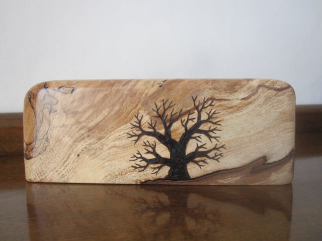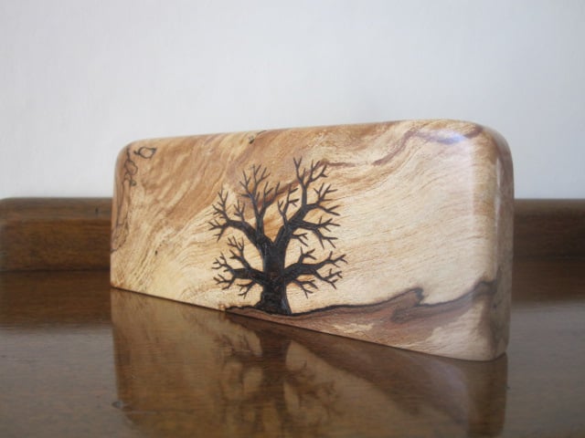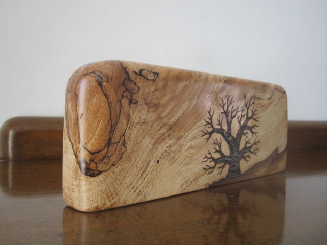 This lovely piece of spalted beech with a tree design has a dramatic feel to it. It is fairly light weighing at around 166g. It measures approximately 19cm x 7cm x 2.2cm.