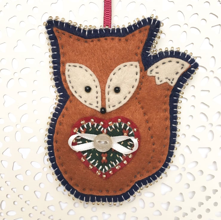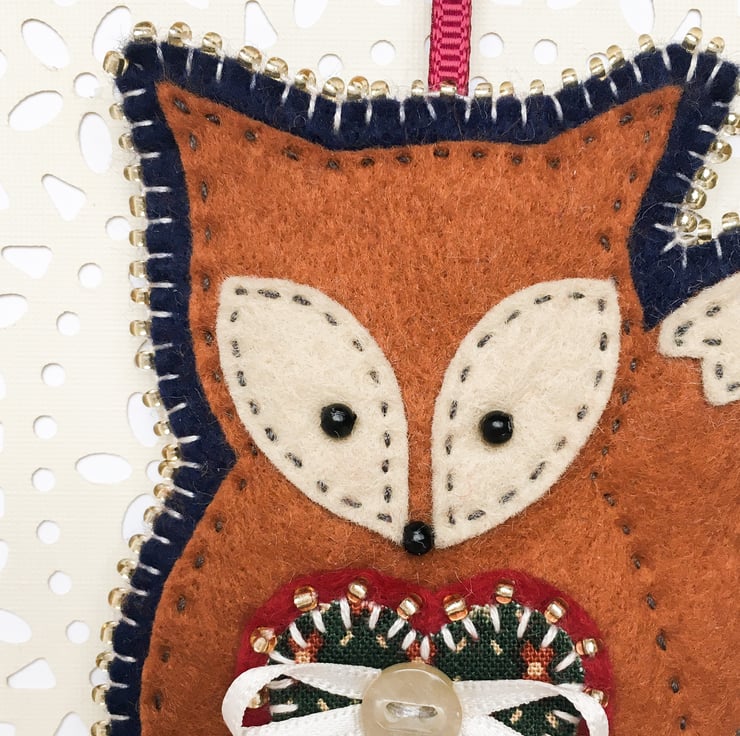 The felt fox is hand stitched and features appliqué details. It has been stitched onto navy blue felt and is edged with gold seed beads which catch the light beautifully. It has been finished with a little ribbon and button detail and has a red hanging loop attached at the top.