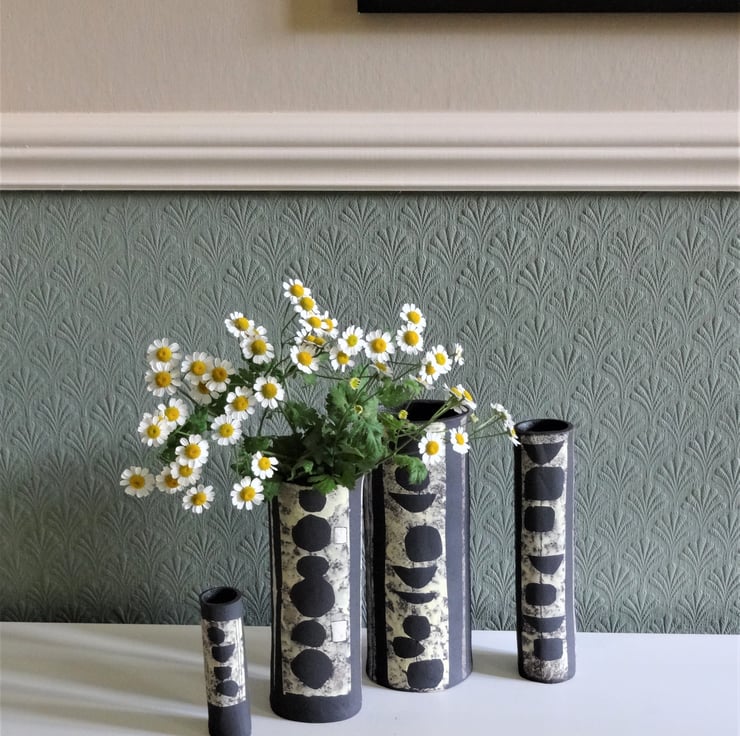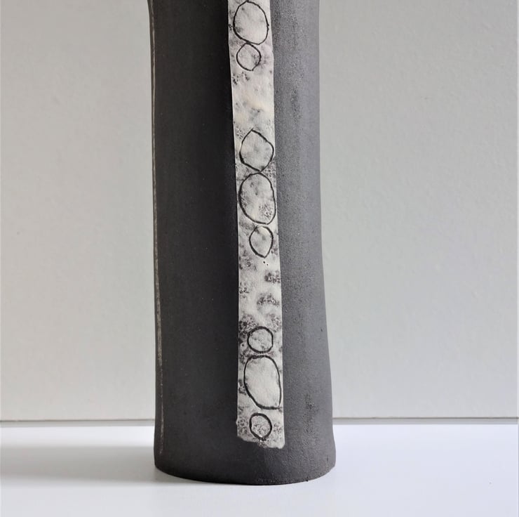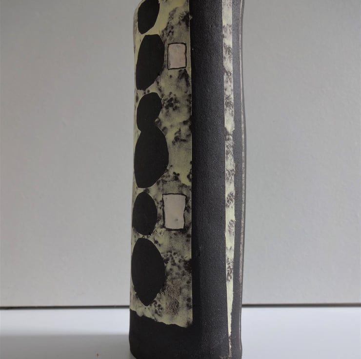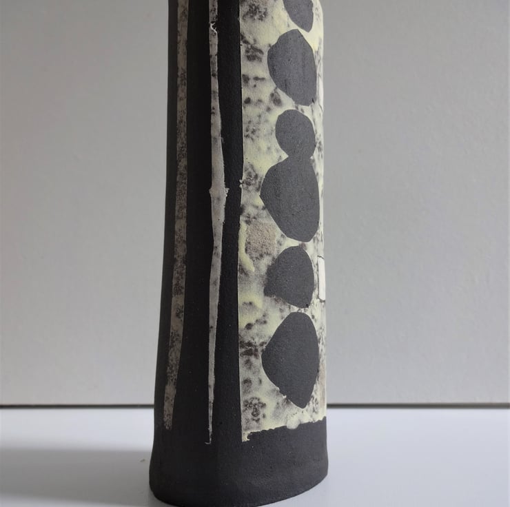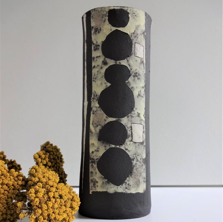 Lemon yellow, white and grey are the colour keynotes of this handmade black stoneware ceramic vessel/vase. Gloria looks good with yellow and white flowers, such as achillea, daffodils, mimosa, daisies or tulips. I created motifs featuring abstract discs, hemispheres and squares, with white, lemon and buff stripes on either side. On the other side I created a thinner white stripe with outlined circles in sgraffito work so you can choose which side to show off – hey presto a reversible vase! The colours are made from liquid clay, known as slip, which I apply with a natural sponge, masking off the areas I want to remain black, before firing the whole piece twice with a final firing to 1185 degrees Celsius. The interior is glazed while the outside is the matt black of the natural clay, contrasting with the pastel slip colours. Gloria is 18 cms tall, with a soft oval cross section 5cms x 6.5 cms approx. I made four similar pieces, each with different patterns and in different sizes, and I have shown a group in one of the images. I hope you agree that they make an eye-catching arrangement with or without flowers!
