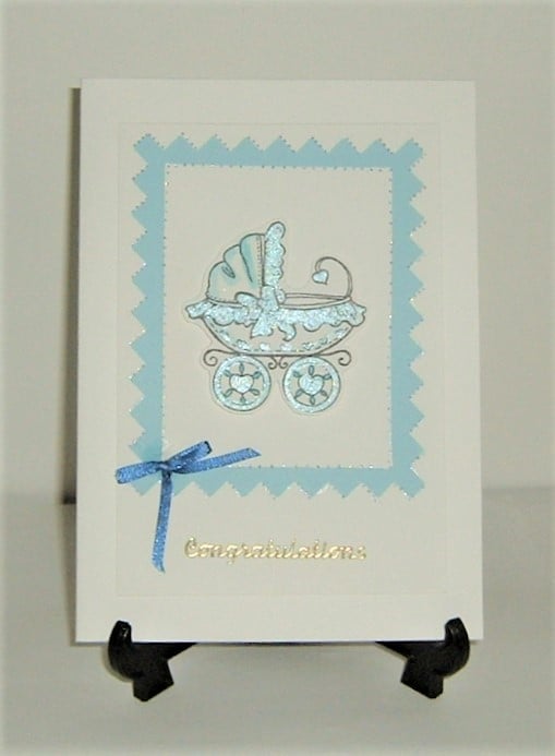 He pram has been hand stamped, cut out and coloured in a delicate blue.
