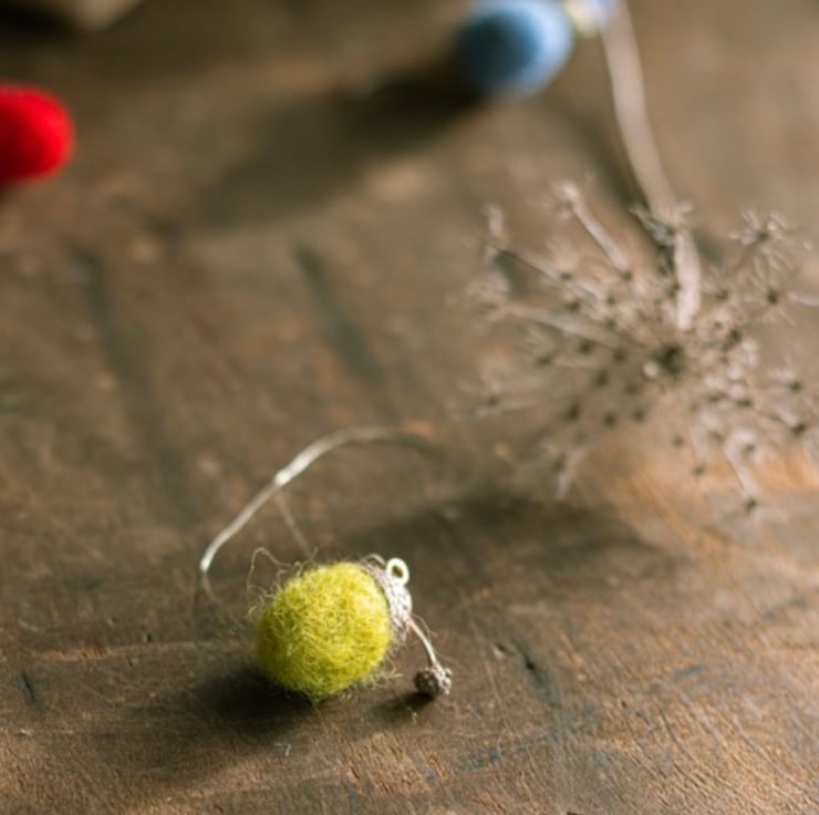 This acorn is made with beautiful, bright green wool. It’s subtle, gold cup complements it perfectly.