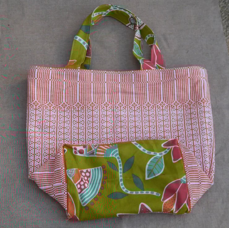 Fully reversible, 100% cotton. Approximately 42 cm/16.5" wide, 33 cm/13" deep, straps 44 cm/17.5" long. Base 25 cm x 18 cm/10" x 7". Washable, best air dried.