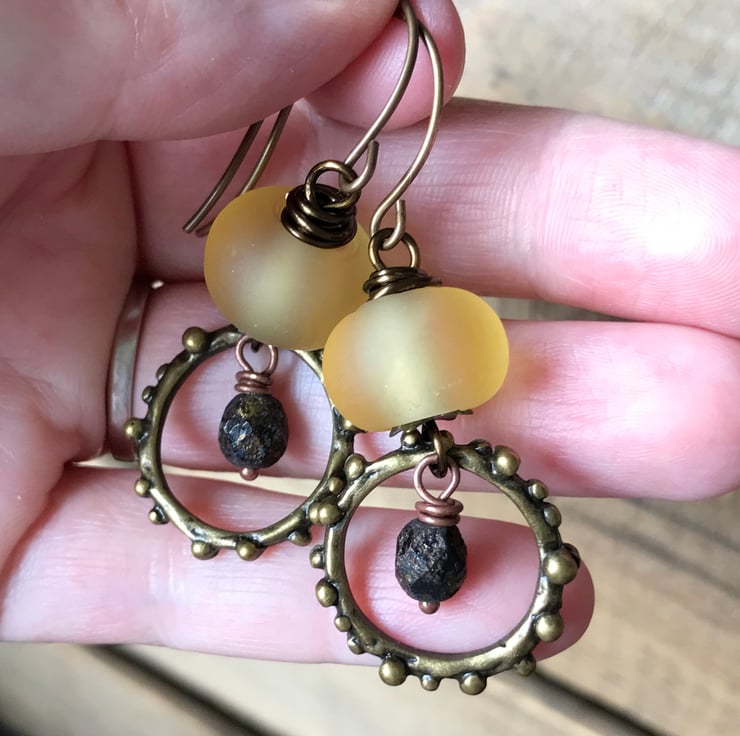 The earrings are finished with round Vintaj brass earwires, and measure approximately 4 cms from the bottom of the earwire and 5 1/2 cms in total from top to bottom.
