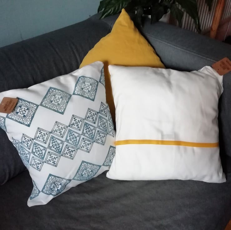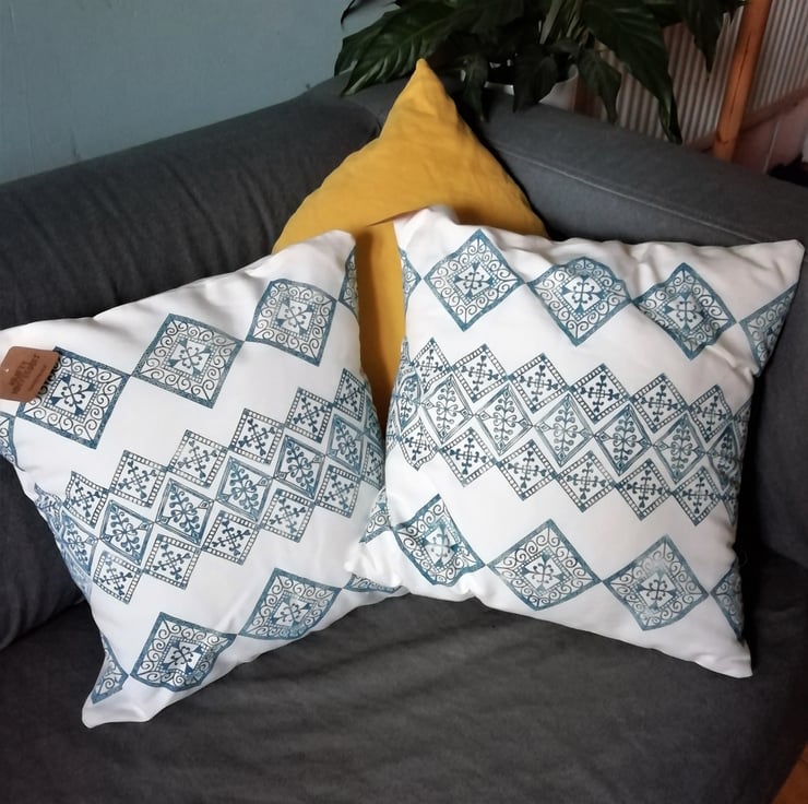 This cushion cover has been handprinted on cotton fabric using the block printing technique with one my hand carved stamps. It has also been hand sewn with an envelope style back with yellow bias binding. I've even hand made and stamped the inner label washing instructions!